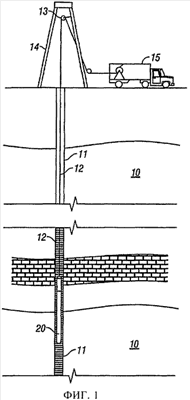 На фиг.1 схематически представлен геологический разрез 10 по стволу скважины 11. Ствол скважины обычно заполнен, по меньшей мере частично, смесью жидкостей, включающей воду, буровой раствор и пластовые флюиды, содержащиеся в горных породах, через которые пробурена скважина. В дальнейшем такие смеси текучих сред именуются скважинными флюидами или жидкостями. Понятие же “пластовый флюид” в дальнейшем используется в отношении конкретного пластового флюида, не содержащего сколько-нибудь существенных примесей жидкостей и газов, которые в естественных условиях отсутствуют в соответствующей вмещающей породе.
