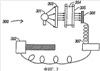 Как показано на фиг.3, в рассматриваемом примере выполнения пробоотборник содержит связанное с ним устройство 300 (опробователь) с двумя сапфировыми окошками, источником 301 ИК-излучения, предпочтительно излучающим на длине волны 1500 нм, коллиматором 303, приемником (детектором) 306 и компьютеризованным насосом 302 со средствами контроля давления. Далее изложен пример последовательности действий при опробовании пласта в условиях скважины.