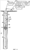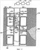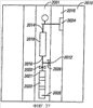 На фиг.25 приведено изображение со структурной схемой, на котором показан выполненный в соответствии с изобретением испытатель пластов, расположенный в скважине на уровне испытуемого пласта, сообщаясь своим пробоотборным зондом с породой-коллектором для проведения испытаний и получения одной или нескольких проб содержащегося в породе флюида. На фиг.25 в вертикальном разрезе показан участок скважины 10, проходящей в область горных пород 11. В скважину 10 на кабеле 12 спущен прибор 13 для взятия проб и проведения измерений (опробователь-измеритель). Этот прибор состоит из силовой гидравлической системы 14, секции 15 накопителя проб флюида и секции 16 пробоотборного механизма. Секция 16 пробоотборного механизма включает в себя избирательно выдвигающийся прижимной башмак 17, упирающийся в стенку скважины, избирательно выдвигающийся пробоотборный зонд 18 для впуска в прибор флюида, а также насос 19 двустороннего действия. При необходимости насос 19 может быть расположен и над пробоотборным зондом 18.