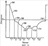Фаза II испытания начинается в момент времени 704, когда давление в приборе упадет ниже пластового давления р*. Угол наклона кривой давления меняется, что обусловлено началом поступления пластового флюида в испытательный объем. Такое изменение угла наклона определяет при помощи скважинного процессора, вычисляющего угол наклона кривой по результатам измерений, полученных за два промежутка времени в пределах одной фазы. Если бы скорость всасывания флюида поддерживалась на постоянном уровне, давление в приборе стремилось бы установиться на некотором уровне, меньшем p*.
