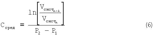 Определение пластового давления р* по неполной кривой восстановления давления можно рассмотреть на примере. В таблице 2 представлены данные гипотетического эксперимента. Проблема заключается в том, чтобы точно определить значение р*, получить которое иным методом не представляется возможным. Для получения р* опытным путем потребовалось бы по меньшей мере 60 секунд, вместо 15 секунд, показанных на фиг.20. Единственной гипотетически известной информацией являются системные значения, приведенные для фиг.19, и объем системы Vсист, равный 269,0 см3. Сжимаемость, С, определяется при помощи уравнения (6) по данным, полученным в начале понижения давления, начиная с гидростатического давления в скважине.