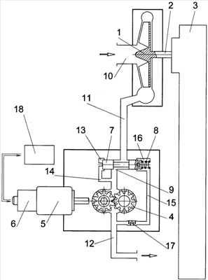 Частота вращения центробежного насоса 1 пропорциональна частоте вращения газотурбинного двигателя 3. Центробежный насос 1 повышает давление топлива. Величина повышения давления топлива центробежным насосом 1 зависит от частоты вращения привода 2 и расхода топлива, то есть от режима работы газотурбинного двигателя 3. По магистрали 11 топливо подается к дросселирующему клапану 7 постоянного перепада давлений. От клапана 7 топливо поступает в объемный дозатор 4. Давление топлива на объемном дозаторе 4 снижается на величину, определяемую настройкой клапана 7. Топливо подается в газотурбинный двигатель 3 по магистрали 12. При этом объемный дозатор 4 дозирует расход топлива пропорционально частоте вращения регулируемого привода 5. Частотой вращения регулируемого привода 5 управляет блок управления 6, который также выдает электрический параметр обратной связи, характеризующий частоту вращения регулируемого привода 5 объемного дозатора 4, в БУ ГТД 18.