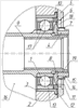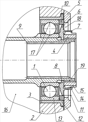 Фланец 5 закреплен на корпусе 2. В полости 16 присутствуют брызги и пары масла с избыточным давлением вследствие барботажа, которые смазывают поверхности 17 подшипника 1. Радиальный зазор 11 препятствует проникновению масла в полость 18. Выступы 8 чашечного замка 7 входят в пазы 19 вала 9.