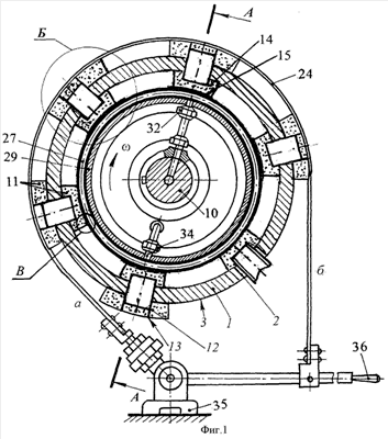 В этом случае работают торовые резиновые пневмокамеры, которые заполняются сжатым воздухом, в результате чего фрикционное покрытие 25, расположенное на наружной поверхности 26 пневмокамеры 27, взаимодействует с рабочими поверхностями 15 дополнительных фрикционных накладок 14 и тем самым притормаживают тормозной шкив 1. Данный тормозной режим является вспомогательным и при его реализации на взаимодействующих парах трения генерируется незначительное количество теплоты и поэтому их трущиеся поверхности не охлаждаются.