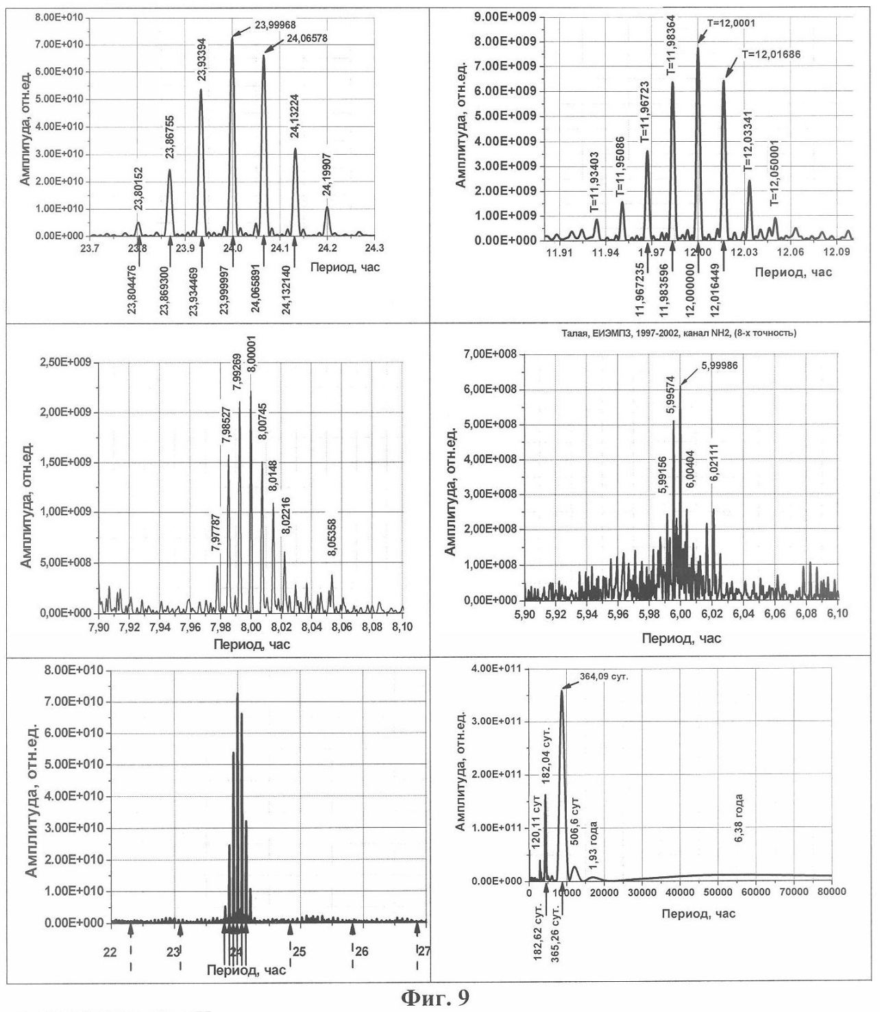 На фиг.9 показаны периодограммы, полученные по минутным значениям интенсивности. Использовался ряд экспериментально зарегистрированных значений интенсивности полей с 12 июня 1997 г. по 15 сентября 2002. Цифры над максимумами кривых – расчетные значения периодов в часах. Сплошными и пунктирными стрелками под фигурами и цифрами указаны приливные компоненты спектров, взятые из монографии Мельхиора [Мельхиор П. Земные приливы. / Под ред. Парийского A.M.: Мир, 1968, 482 с. (пер. с англ.)]. Сплошные стрелки – полосы приливов солнечного происхождения, пунктирные – лунные компоненты приливных волн.