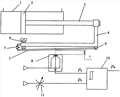 При выдвижении штока 3 величина измерительного зазора s между поворотной планкой 5 и пневматическим датчиком 8 уменьшается и на его выходе, а следовательно и на входе управления струйного порогового устройства 10 величина давления ру возрастает. При достижении этим давлением уровня давления переключения струйного порогового устройства 10, определяемого величиной давления смещения рс, пороговое устройство переключается. На его выходе установится давление рв, которое может быть использовано в качестве управляющей команды на остановку поршня, а также, при необходимости, на изменение скорости или направления его движения.