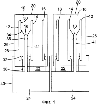 На фиг.1 схематично показано сечение вида сбоку сборки, состоящей из двух телекоммуникационных модулей 10. Каждый модуль 10 выполнен вытянутым в направлении, перпендикулярном плоскости фиг.1. В сечении виден только единственный контакт 12, 14, 16 каждого телекоммуникационного модуля 10, при этом каждый из этих контактов представляет собой, с учетом протяженности перпендикулярно плоскости чертежа, ряд контактов. Другими словами, другие контакты 12, 14, 16 расположены “впереди” и “позади” контактов, показанных на фиг.1.