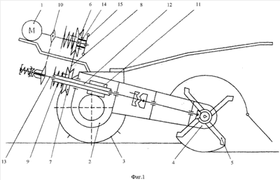 Почвообрабатывающая фреза работает следующим образом. Устройство подводят к краю обрабатываемого участка. К электродвигателю 1 подводится питание, и фреза начинает обрабатывать почву. По мере того как почвообрабатывающая фреза начинает двигаться по уплотненным участкам, на ее конструкцию начинают действовать перегрузки, что приводит к снижению эффективности эксплуатации, к повышению затрат энергии и неравномерной загрузке электродвигателя 1, к повышению динамики перегрузок на рабочие органы и элементы привода, а также ухудшению качества обработки почвы. Для понижения скорости перемещения почвообрабатывающей фрезы на ведущем шкиве 6 клиноременного вариатора вращают маховичок 14, который, действуя на толкатели 14, уменьшает диаметр ведущего шкива 6. При этом ремень 8 входит в пазы ведущего шкива 6 и его натяжение ослабевает. Пружины 9, действуя на подвижную часть ведомого шкива 7, увеличивают его диаметр, и происходит натяжение ремня 8. Неподвижная часть ведомого шкива 7 имеет возможность вращаться относительно центрального вала 13 с другой частотой вращения. Крутящие моменты, передаваемые от электродвигателя 1 на рабочие органы 5 и ходовые органы 3, будут независимые: на рабочих органах 5 крутящий момент будет постоянен, а на ходовых колесах 3 можно варьировать за счет клиноременного вариатора. Когда необходимо повысить скорость перемещения электрофрезы, то диаметры на ведущем 6 и ведомом шкивах 7 клиноременного вариатора изменяют на обратные величины.