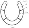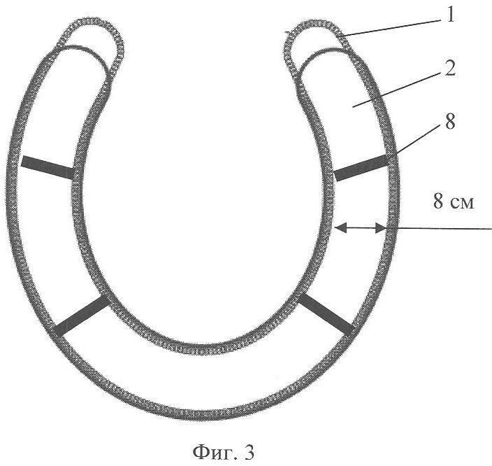 Вариант исполнения гигиенической прокладки разового использования для сидения унитаза (общий вид снизу), когда в качестве элемента для открепления от сиденья унитаза гигиеническая прокладка содержит нить, прикрепленную к внешнему контуру многослойного элемента с образованием двух свободных петлеобразных участков нити для ее захвата, ширина многослойного элемента гигиенической прокладки разового использования для сидения унитаза превышает ширину сиденья унитаза на 4 см и равна 8 см, липкие элементы для прикрепления многослойного элемента к сиденью унитаза расположены на боковых частях многослойного элемента гигиенической прокладки, представлен на фиг.3.