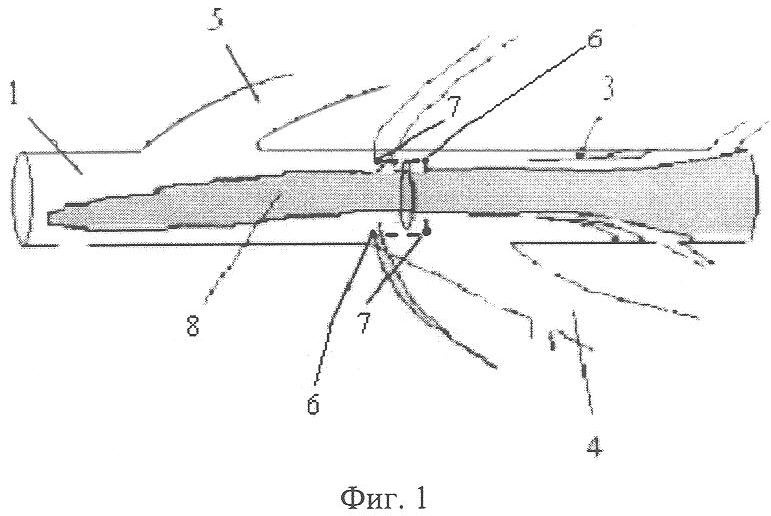 Осуществляют доступ с выделением только передней стенки вены, например общей бедренной вены 1 (фиг.1), затрагивая адвентицию только на протяжении предполагаемого разреза. В проекции основания флотирующей части тромба 8 на стенку вены 1 в поперечном направлении монофиламентной нерассасывающейся нитью накладывают два П-образных шва-держалки с точками вкола 6 и точками выкола 7, как показано на фигуре 1. П-образный шов-держалка имеет четыре точки «вкола-выкола». Осуществляют поперечный разрез вены так, что точки 7 выкола с исходящими из них нитями находятся левее линии разреза, а точки 6 вкола расположены правее линии разреза. Величина разреза, как правило, не превышает 1/2 длины окружности вены 1. Флотирующая часть тромба 8, имитируя включение брюшно-кавального насоса, выводится в рану под давлением обратного тока крови, как показано на фигуре 2.