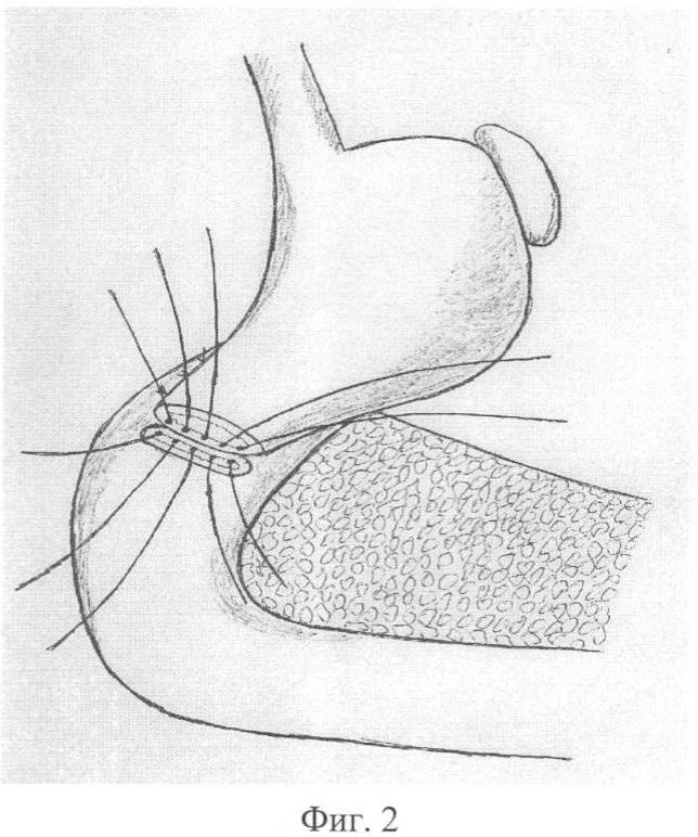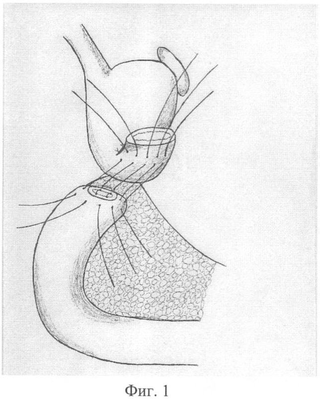 После мобилизации желудка по обеим кривизнам в необходимых пределах и выделения начального отдела двенадцатиперстной кишки из спаечного процесса желудок отсекают по уровню стеноза. При отсутствии задней стенки двенадцатиперстной кишки дополнительная ее мобилизация не производится. Выполняют гемостаз по краям стенозированного просвета двенадцатиперстной кишки. Производят резекцию желудка и формируют его культю. Затем накладывают первый ряд поперечного терминолатерального гастродуоденоанастомоза фиг.1. В шов последовательно захватывают стенку желудка (вкол на расстоянии 2-2,5 см от просвета культи желудка с захватом 0,8-1 см стенки желудка), латеральная стенка кишки. Накладывают 1-3 таких шва до стенозированного просвета. В проекции просвета кишки в шов захватывают стенку желудка (аналогично предыдущим швам на желудке), рубцовую ткань и заднюю стенку кишки с выколем в подслизистом слое (при отсутствии задней стенки кишки в шов берут плотную рубцовую ткань с выколом в подслизистом слое), переднюю стенку двенадцатиперстной кишки (вкол в подслизистом слое и выкол на серозе с захватом 1 см передней стенки. Затем накладывают на медиальную стенку двенадцатиперстной кишки 1-3 шва, аналогичные наложенным первоначально на латеральную стенку кишки. Швы берут на держалки и затем последовательно завязывают. Этим приемом одновременно закрывают стенозированный просвет двенадцатиперстной кишки и формируют первый ряд терминолатерального гастродуоденоанастомоза. Нити срезают, оставляя боковые в качестве держалок. Далее выполняют поперечную дуоденотомию на треть диаметра кишки на уровне края культи желудка. Накладывают отдельные узловые серозно-подслизистые швы на заднюю губу анастомоза фиг.2. Затем формируют переднюю губу гастродуоденального анастомоза в зависимости предпочтений хирурга однорядным (отдельные серозно-мышечно-подслизистые швы) или двухрядным узловым швом (отдельные серозно-подслизистые, затем серозно-мышечные швы) с укреплением латерального угла на стыке трех стенок по общепринятой методике.