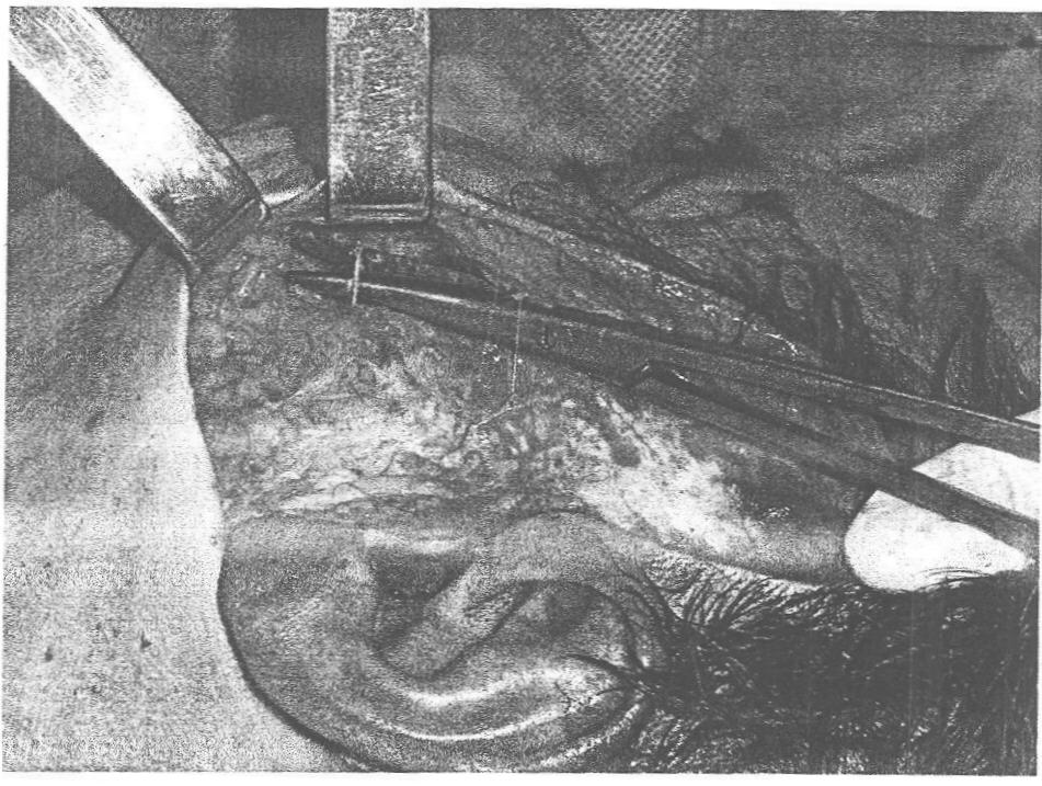 Больному выполнена операция: Подтяжка кожи лица, т.е. в ходе операции по предлагаемому нами способу, отступая на 1-2 см от края рассечения кожи, в подкожно-жировом слое ткани разделены путем расслоения с формированием множественных тоннелей. В перегородках между тоннелями с помощью бинокулярной лупы обнаружены и выделены перфорантные артериальные, венозные и лимфатические сосуды путем расслоения перегородок. Вокруг выделенных сосудов косо-вертикальными движениями браншей сосудистых ножниц и сосудистого зажима разведены мобилизуемый кожно-жировой лоскут и глубжележащие ткани, поочередно меняя расположение инструмента и направление разведения вокруг каждого обнаруженного сосуда. В результате достигнуто требуемое для перемещения тканей выделение перфорантных сосудов из паравазальных тканей с расстоянием между кожно-жировым лоскутом и подлежащими тканями до 5 см. Выполнено сбаривание мышечно-фасциальной системы под мобилизованным кожно-фасциальным лоскутом. Кожно-жировой лоскут натянут. Излишек мобилизованного лоскута иссечен. Рана ушита.