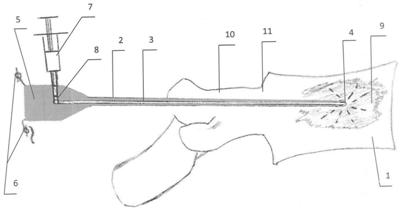 Больной укладывается на операционном столе в положении на животе. Производится разметка операционного поля, где указываются ориентиры для введения пункционной иглы-звуковода 2. После этого под рентгеноконтролем, под местной анестезией игла-звуковод 2 с каналом доставки 3 внутри вводится через ножку 10 и корень дуги 11 в тело поврежденного позвонка 1 и подсоединяется к электроакустическому преобразователю 5, соединенному через клеммы 6 с источником ультразвуковой генерации. Диаметр иглы-звуковода выбирается в зависимости от размеров ножки и корня дуги позвонка (от 3 до 6 мм). После установки иглы-звуковода 2 готовят костно-замещающую цементную массу. Для этого смешивают костнозамещающий цемент и растворитель. В момент перемешивания производят ультразвуковое воздействие на формирующуюся цементную массу для дробления образующихся пузырьков воздуха. После этого приготовленную костнозамешающую цементную массу набирают в нагнетатель (шприц) 7 и через переходник 8 соединяют с каналом доставки 3 иглы-звуковода 2. Затем при помощи нагнетателя (шприца) 7 по каналу доставки 3 с одновременным ультразвуковым воздействием нагнетают подготовленную костнозамещающую цементную массу 9 в тело позвонка 1, где также продолжают контактное ультразвуковое воздействие для дробления пузырьков воздуха и уплотнения костнозамещающей цементной массы. Ультразвуковое воздействие осуществляют при следующих параметрах: частота ультразвуковых колебаний иглы-звуковода 2 и излучателя иглы-звуковода 4 – от 5 до 10 МГц, удельная мощность – от 2 до 5 Вт/см2. После восстановления тела позвонка 1 иглу-звуковод 2 удаляют и накладывают асептическую повязку и оставляют больных на несколько минут в неподвижном состоянии.