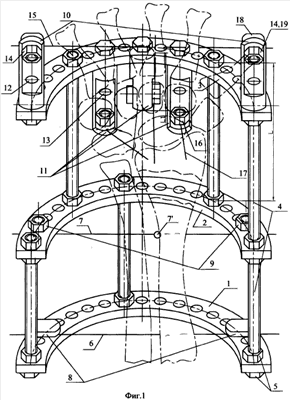 Устройство содержит проксимальное, среднее и дистальное кольца, соответственно 1, 2, 3 (или полукольца), резьбовые штанги 4, скрепляющие эти кольца с помощью гаек 5, навинченных на штанги 4 с двух противоположных торцов колец.