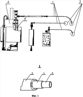 Кроме того, возможно дополнительно непосредственно перед криоорошением эвакуацию паровой фазы хладона вести при открытом клапане 7 и закрытом вентиле 6 через зонд, обдувая операционное поле. При этом с операционного поля удаляется излишняя капельная жидкость. Затем клапан 7 закрывают, емкость 4 криооросителя переворачивают и все последующие действия производят, как в способе, описанном выше.