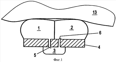 Вариант выполнения на фиг.4 отличается далее от варианта выполнения на фиг.3 тем, что обе камеры 1, 2 расположены друг над другом по отношению к стенке 13 желудка. При этом камеры 1, 2 расположены друг над другом радиально, причем сенсорная камера 1 расположена у стенки 13 желудка или стенки пищевода, а камера 2 – над камерой 1, при необходимости через промежуточный слой 16. За счет расположения камер 1, 2 друг над другом возникает иная ситуация с давлением, чем у расположенных рядом друг с другом камер 1, 2. В случае расположенных друг над другом камер 1, 2 у одноконтурной системы на фиг. 1, 2 не возник бы обратный поток жидкости из сужающей желудок камеры 2 в сенсорную камеру 1, поскольку в обеих камерах 1, 2 господствует одинаковое давление, т.к. обе камеры расположены друг над другом между стенкой 13 желудка и спинкой 4. Рестрикция при перемещении жидкости из сенсорной камеры 1 в сужающую желудок камеру 2 происходит только тогда, когда сужающая желудок камера 2 уже, чем сенсорная камера 1. Таким образом, одновременно решена также проблема перепада давлений. Для усилия, оказываемого обеими камерами 1, 2 на общую граничную поверхность А, справедливо F=р А. За счет большей поверхности, которой сенсорная камера 1 контактирует с граничной поверхностью, усилие сенсорной камеры 1 выше усилия сужающей желудок камеры 2 с меньшей поверхностью контактирования. Поэтому сужающая желудок камера 2 имеет тенденцию опорожнения в сенсорную камеру 1. Жидкость течет по окончании еды обратно в сенсорную камеру 1, и ширина желудка снова увеличивается.