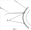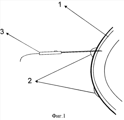 Способ осуществляют следующим образом: после трехкратной инстилляционной анестезии вставляют векорасширитель. Микродиатермопункцию булл проводят в амбулаторных условиях, под контролем щелевой лампы. С помощью остроконечного игольчатого электрода производят прокалывание (пункцию) буллы, включая передний стромальный слой роговицы (фиг.1). После проведения процедуры микродиатермопункции роговицы за нижнее веко закладывают антибактериальную глазную мазь и накладывают заклейку на глаз на период 12 часов для стимуляции эпителизации роговицы. Пациенту назначают капли антисептика либо антибиотика во избежание присоединения вторичной инфекции. Для проведения данной методики мы используем микродиатермокоагулятор ЭХВЧ 20-01 МТУСИ, силу тока 1,0-2,0 мА и остроконечный игольчатый микроэлектрод.