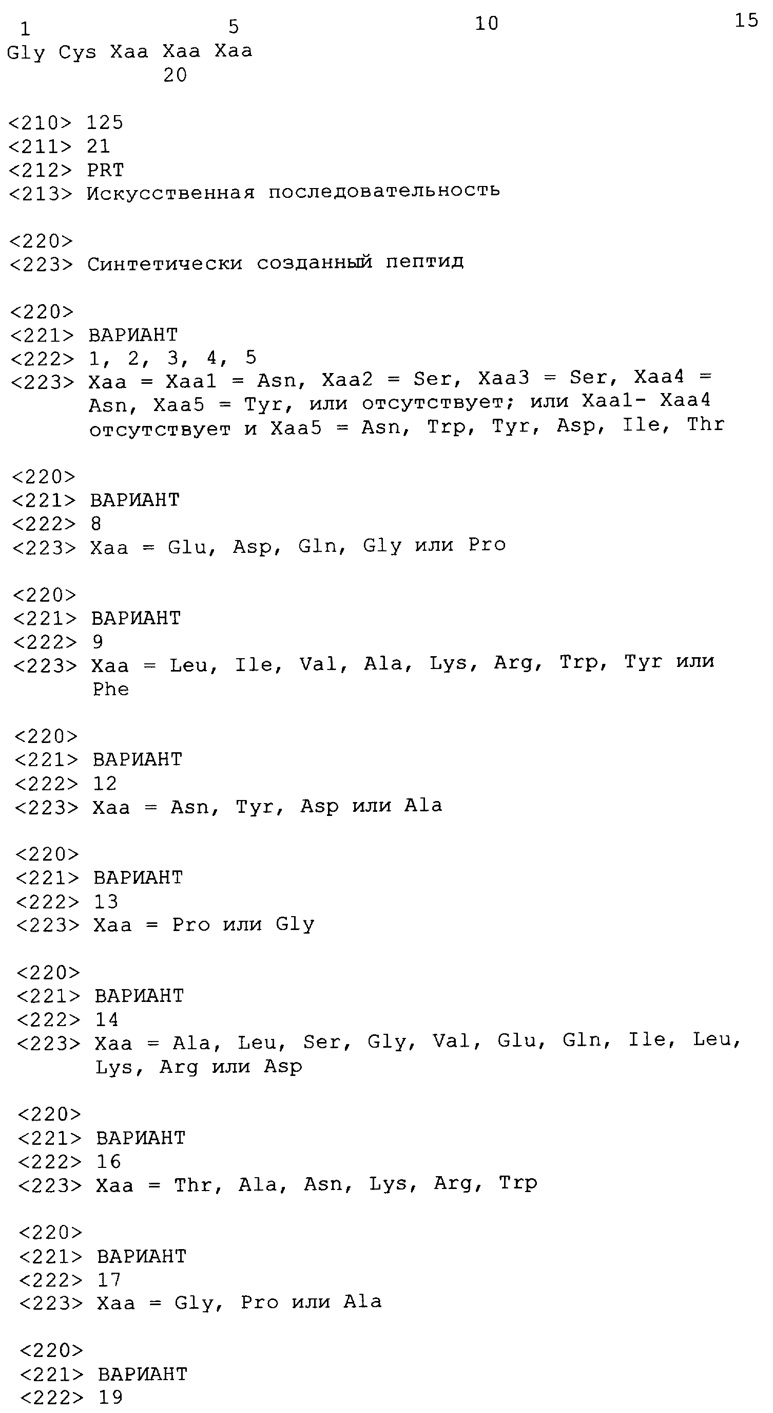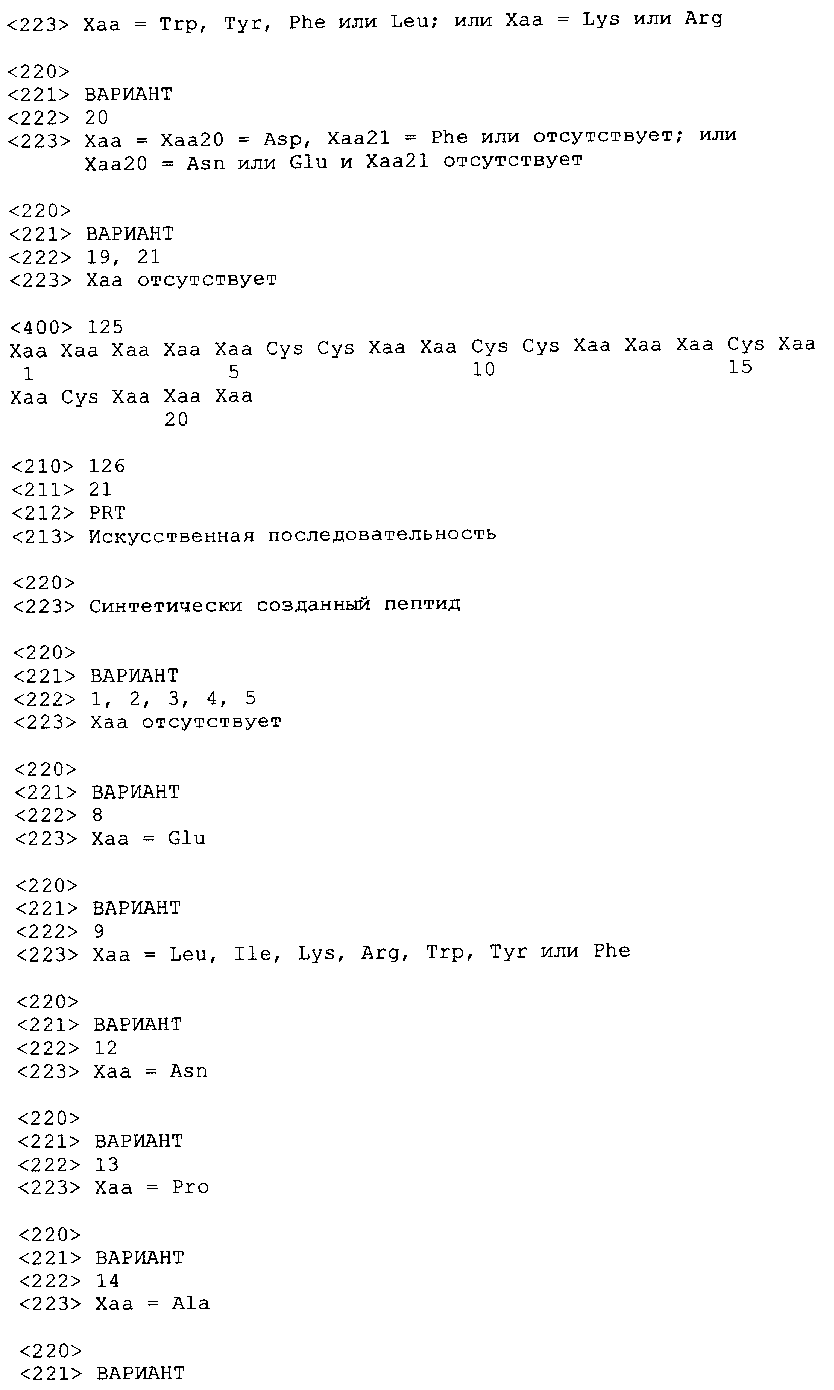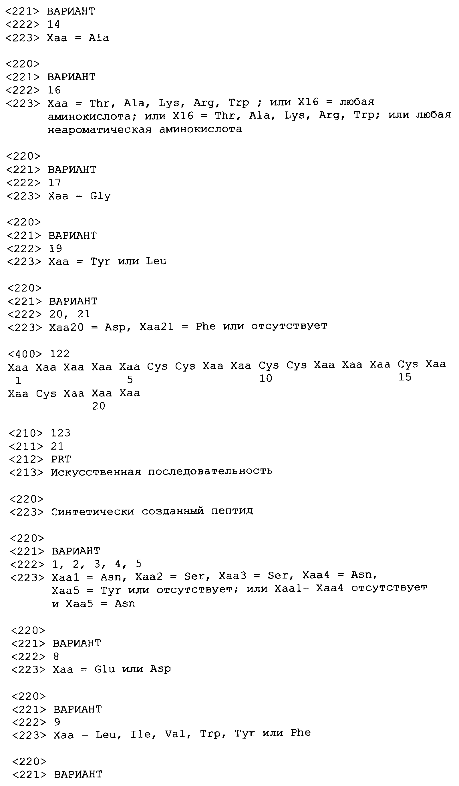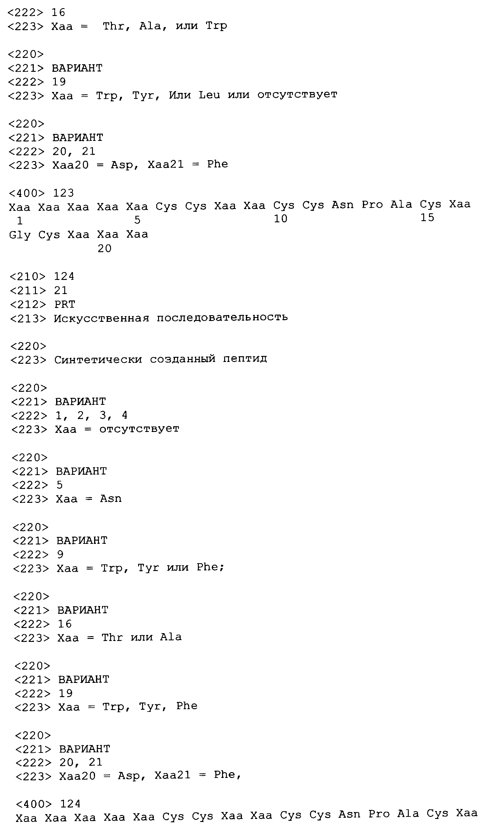Xaa16 Gly17 Cys18 Xaa19 Xaa20 Xaa21, где Xaa1 Xaa2 Xaa3 Xaa4 Xaa5 является Asn Ser Ser Asn Tyr или отсутствует или Xaa1 Xaa2 Xaa3 Xaa4 отсутствует и Xaa5 является Asn; Xaa8 является Glu или Asp; Xaa9 является Leu, Ile, Val, Trp, Tyr или Phe; Xaa16 является Thr, Ala, Trp; Xaa19 является Trp, Tyr, Phe или Leu или отсутствует и Xaa20Xaa21 является AspPhe.