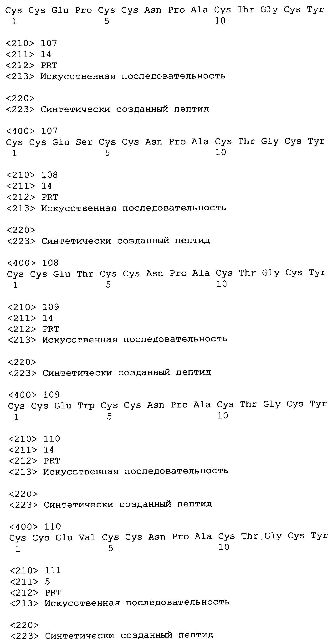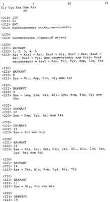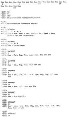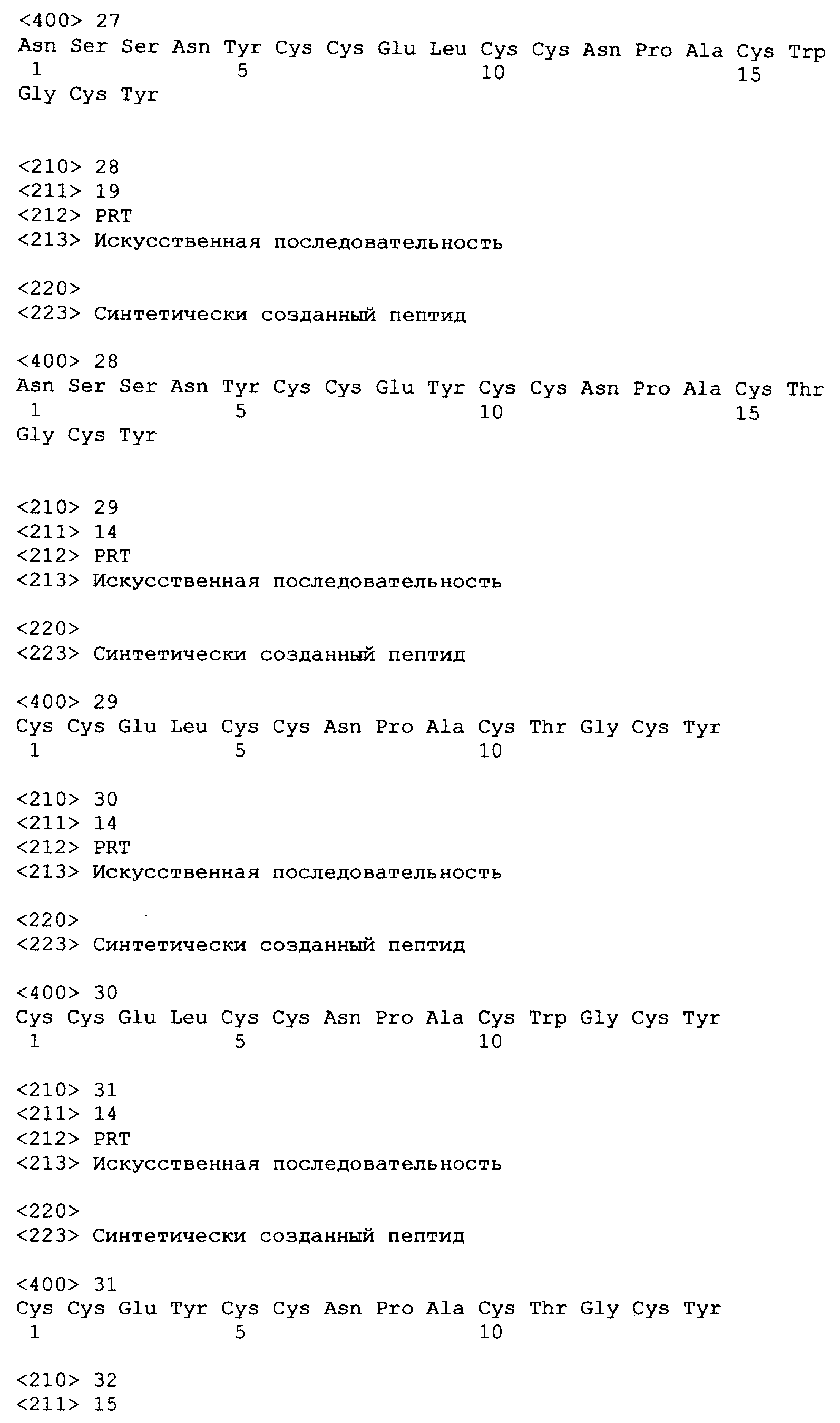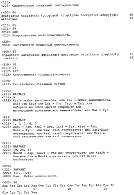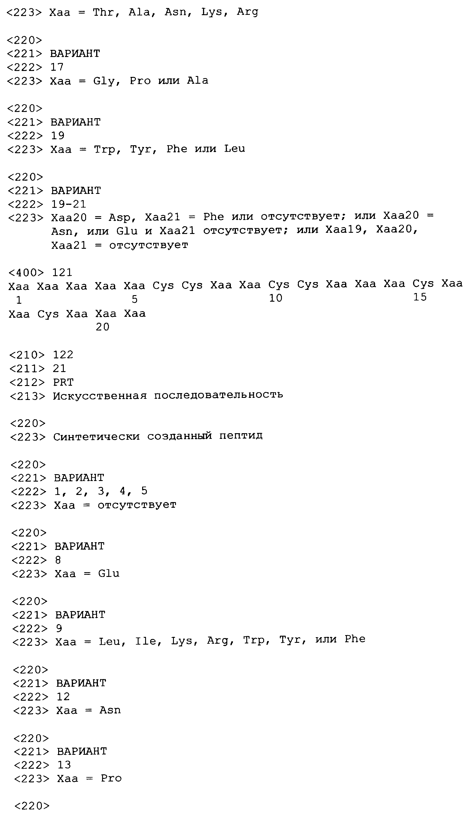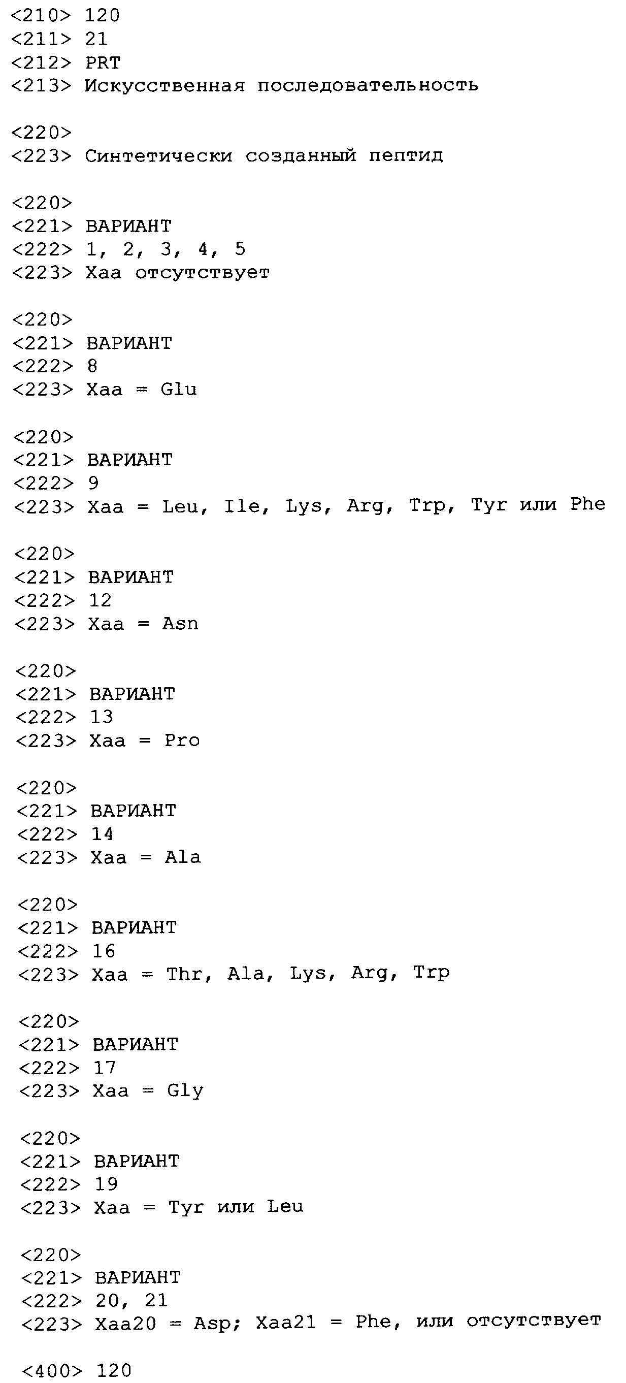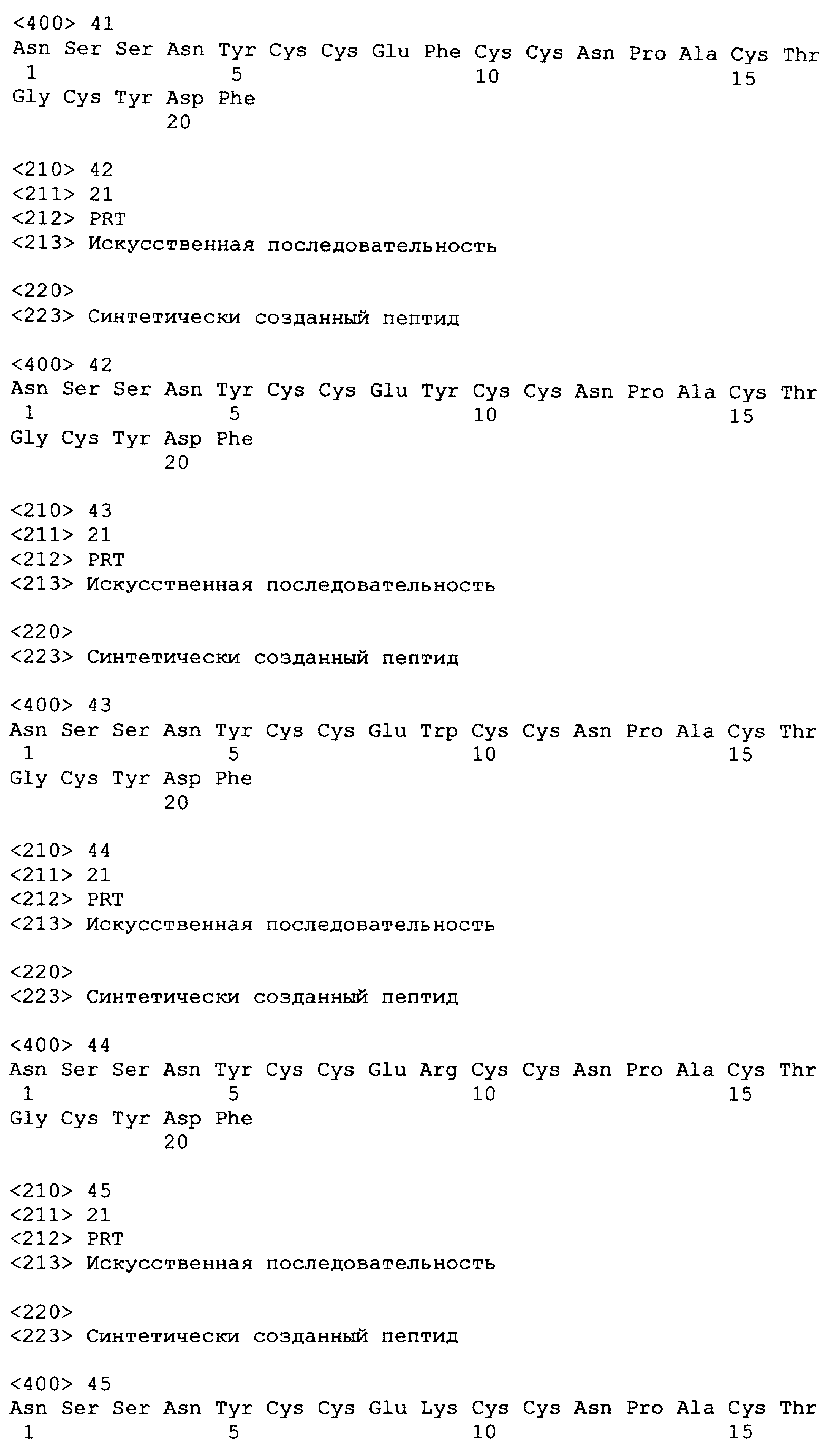 Xaa16 Gly17 Cys18 Xaa19 Xaa20 Xaa21, где Xaa1 Xaa2 Xaa3 Xaa4 Xaa5 является Asn Ser Ser Asn Tyr или отсутствует или Xaa1 Xaa2 Xaa3 Xaa4 отсутствует и Xaa5 является Asn; Xaa8 является Glu или Asp; Xaa9 является Leu, Ile, Val, Trp, Tyr или Phe; Xaa16 является Thr, Ala, Trp; Xaa19 является Trp, Tyr, Phe или Leu или отсутствует и Xaa20Xaa21 является AspPhe.