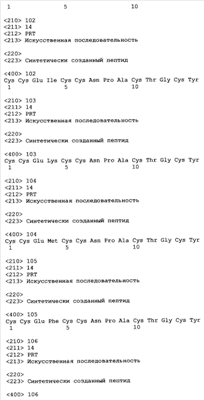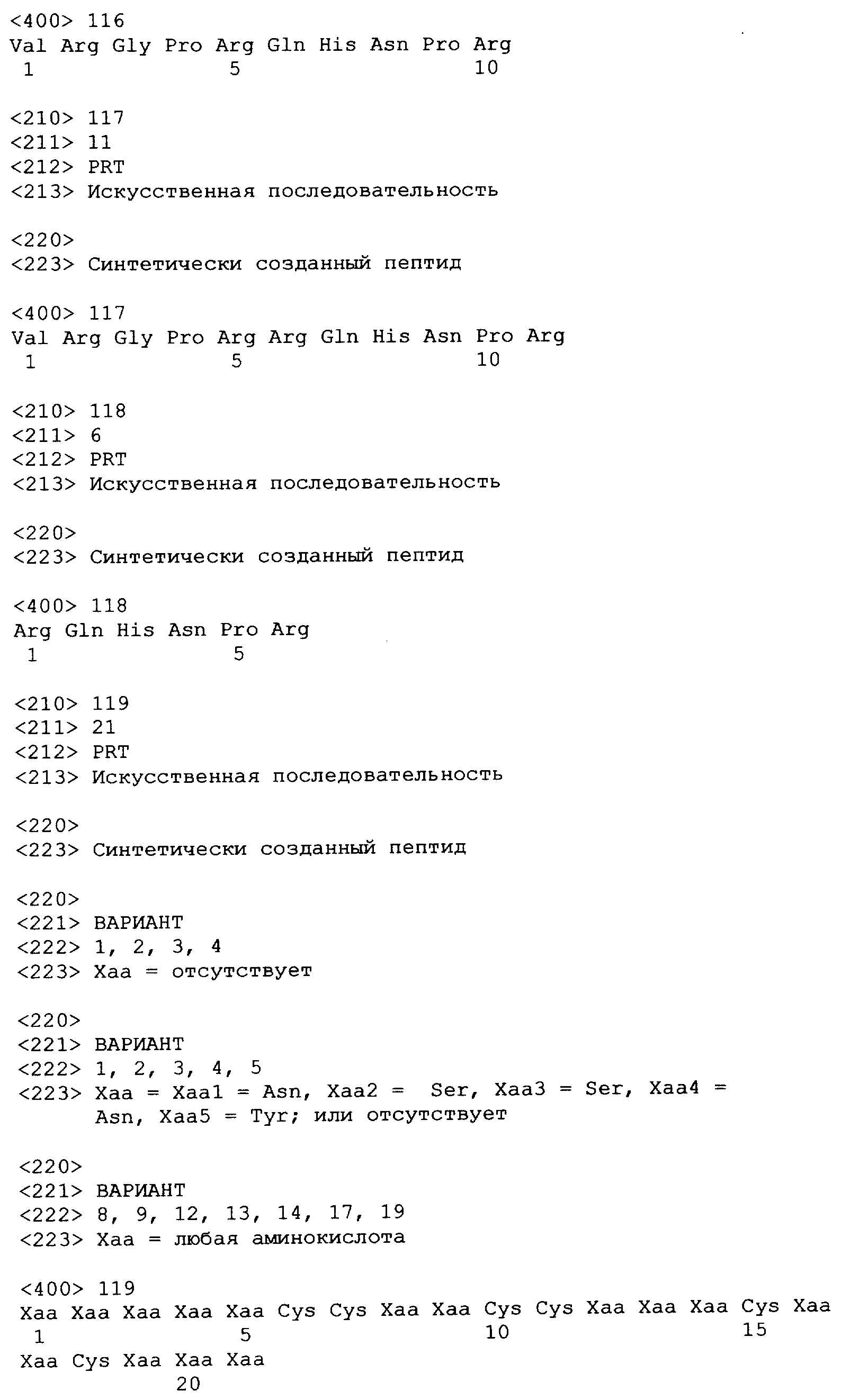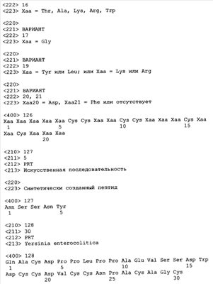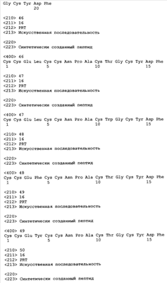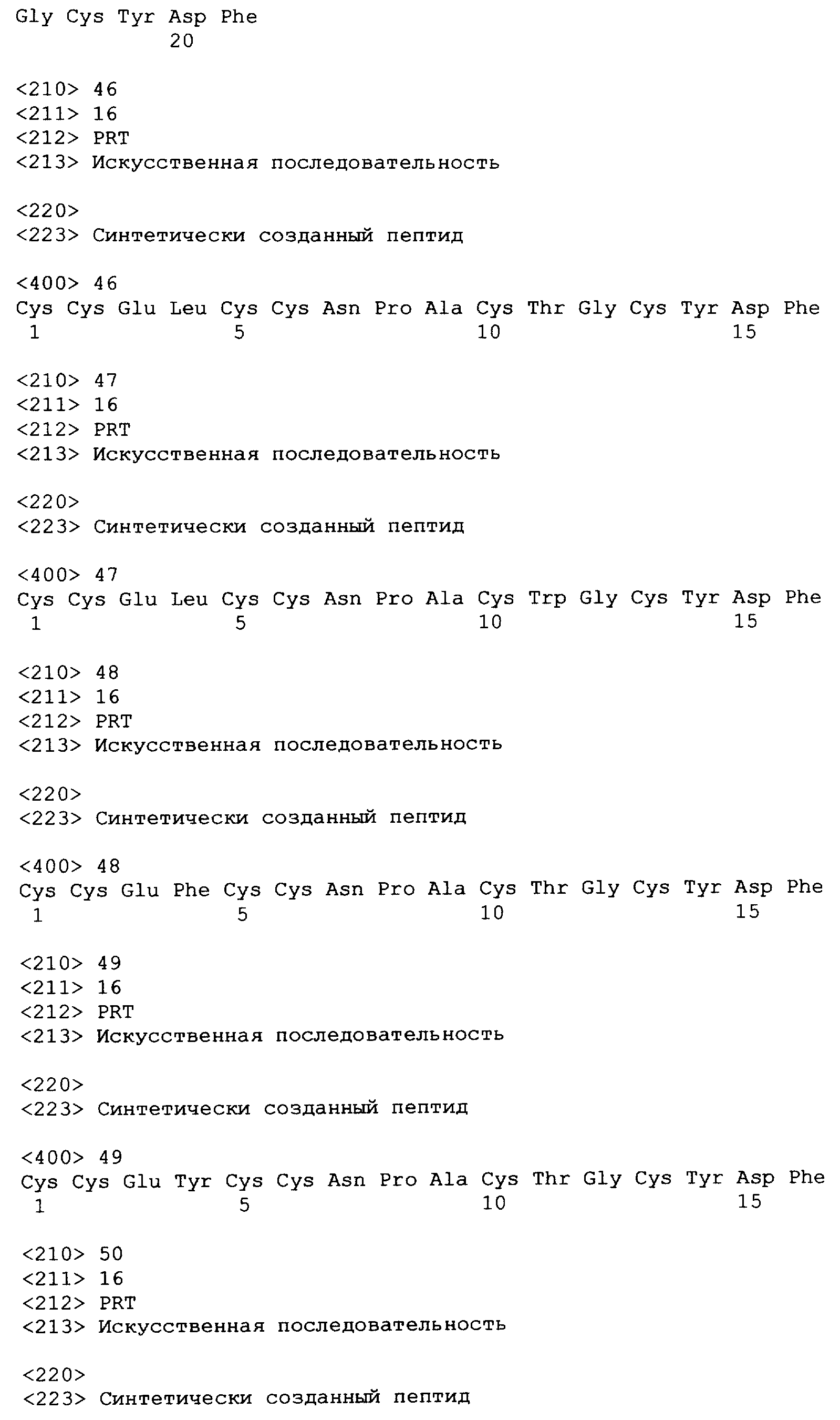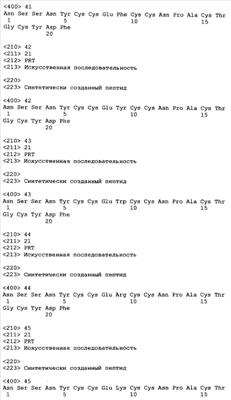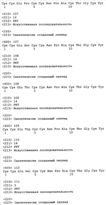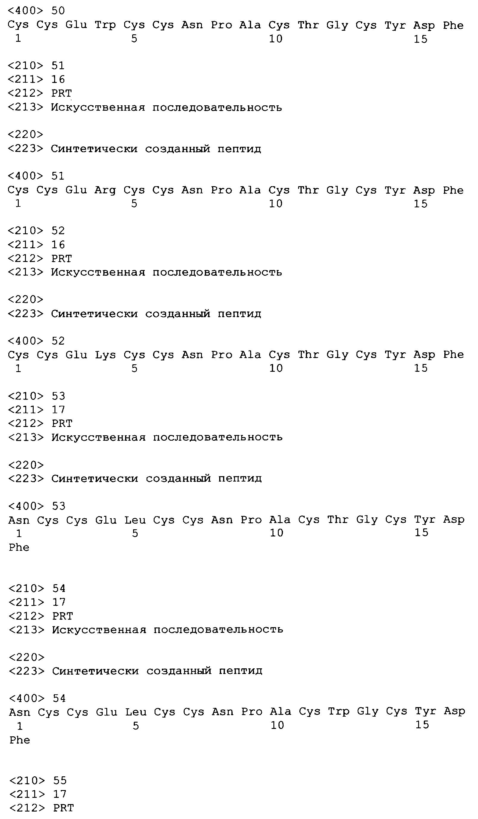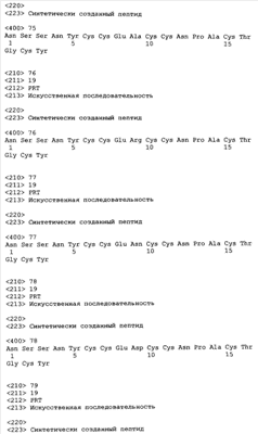 Xaa16 Gly17 Cys18 Xaa19 Xaa20 Xaa21, где Xaa1 Xaa2 Xaa3 Xaa4 Xaa5 является Asn Ser Ser Asn Tyr или отсутствует или Xaa1 Xaa2 Xaa3 Xaa4 отсутствует и Xaa5 является Asn; Xaa8 является Glu или Asp; Xaa9 является Leu, Ile, Val, Trp, Tyr или Phe; Xaa16 является Thr, Ala, Trp; Xaa19 является Trp, Tyr, Phe или Leu или отсутствует и Xaa20Xaa21 является AspPhe.