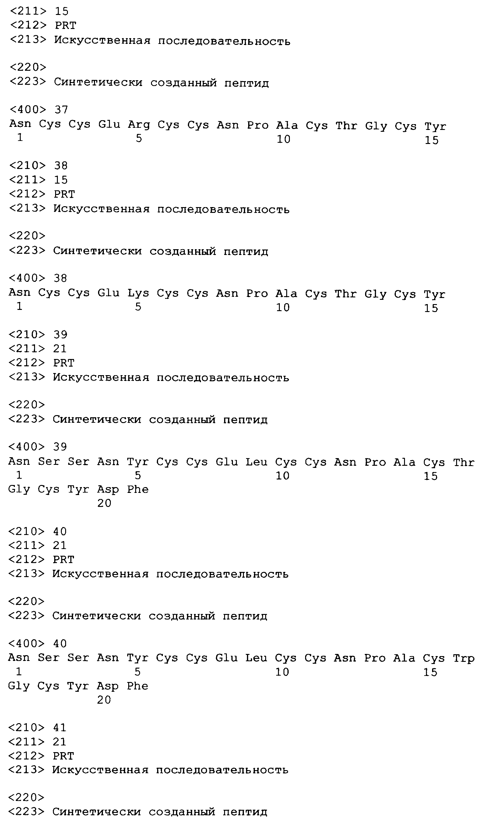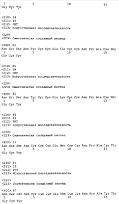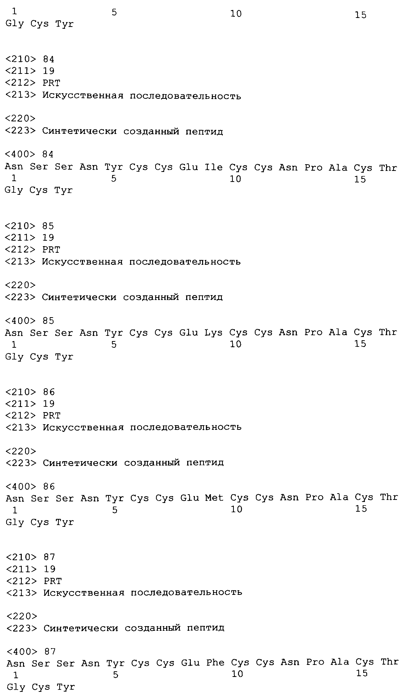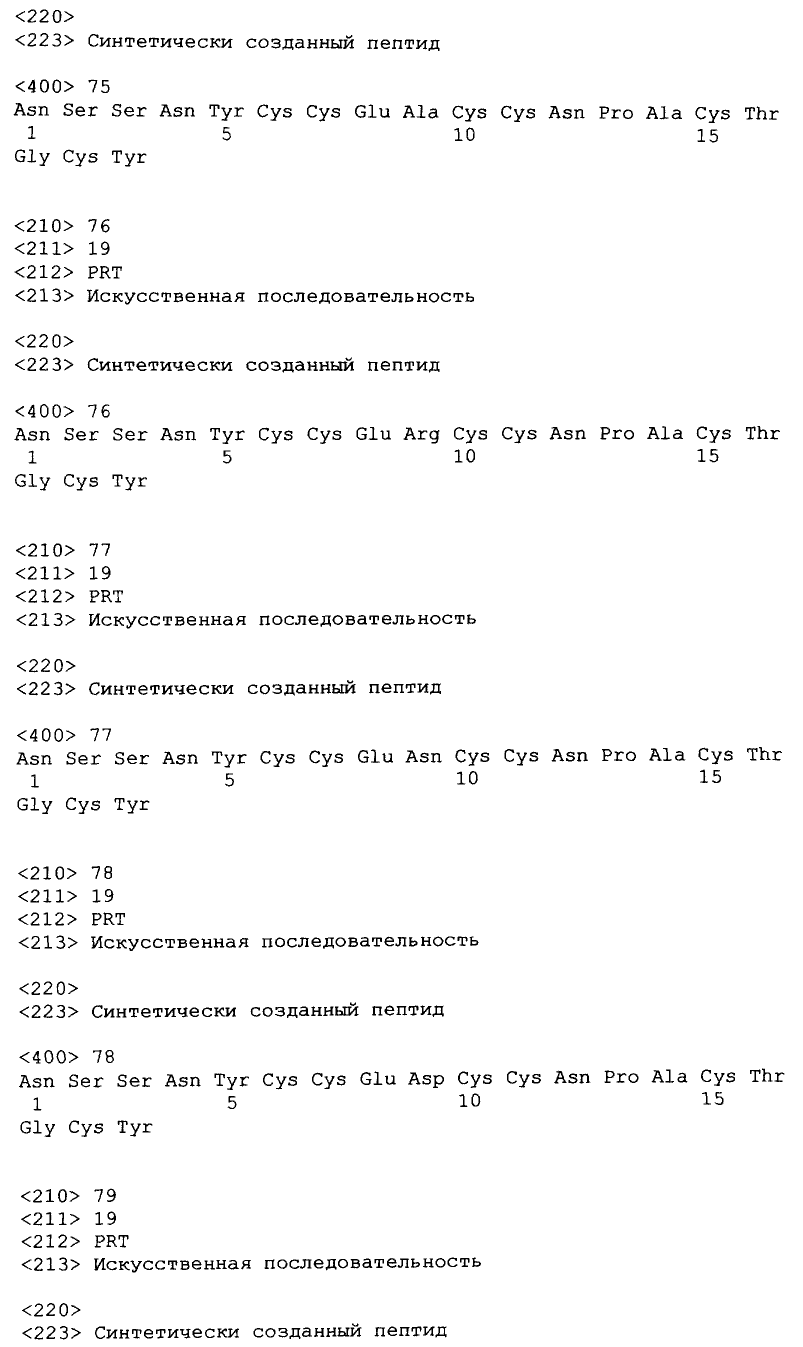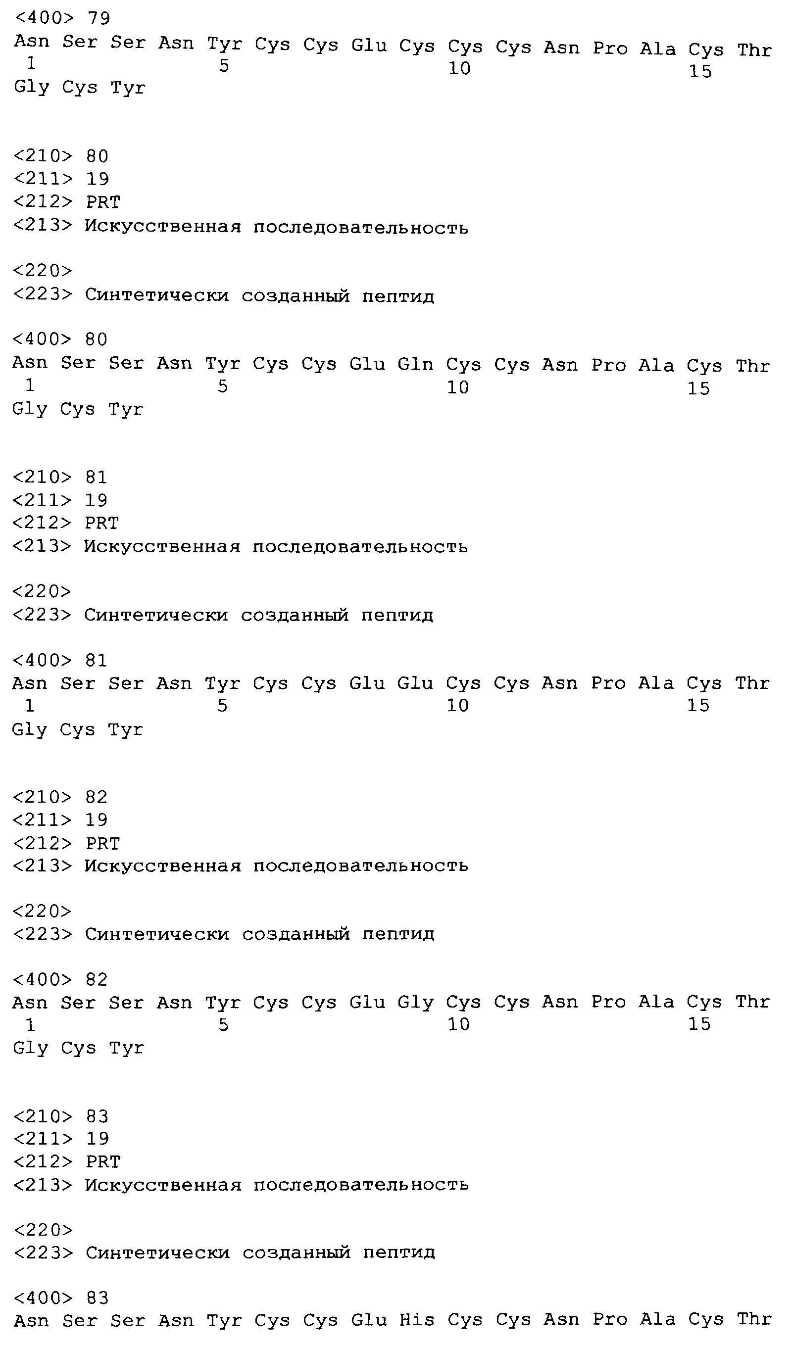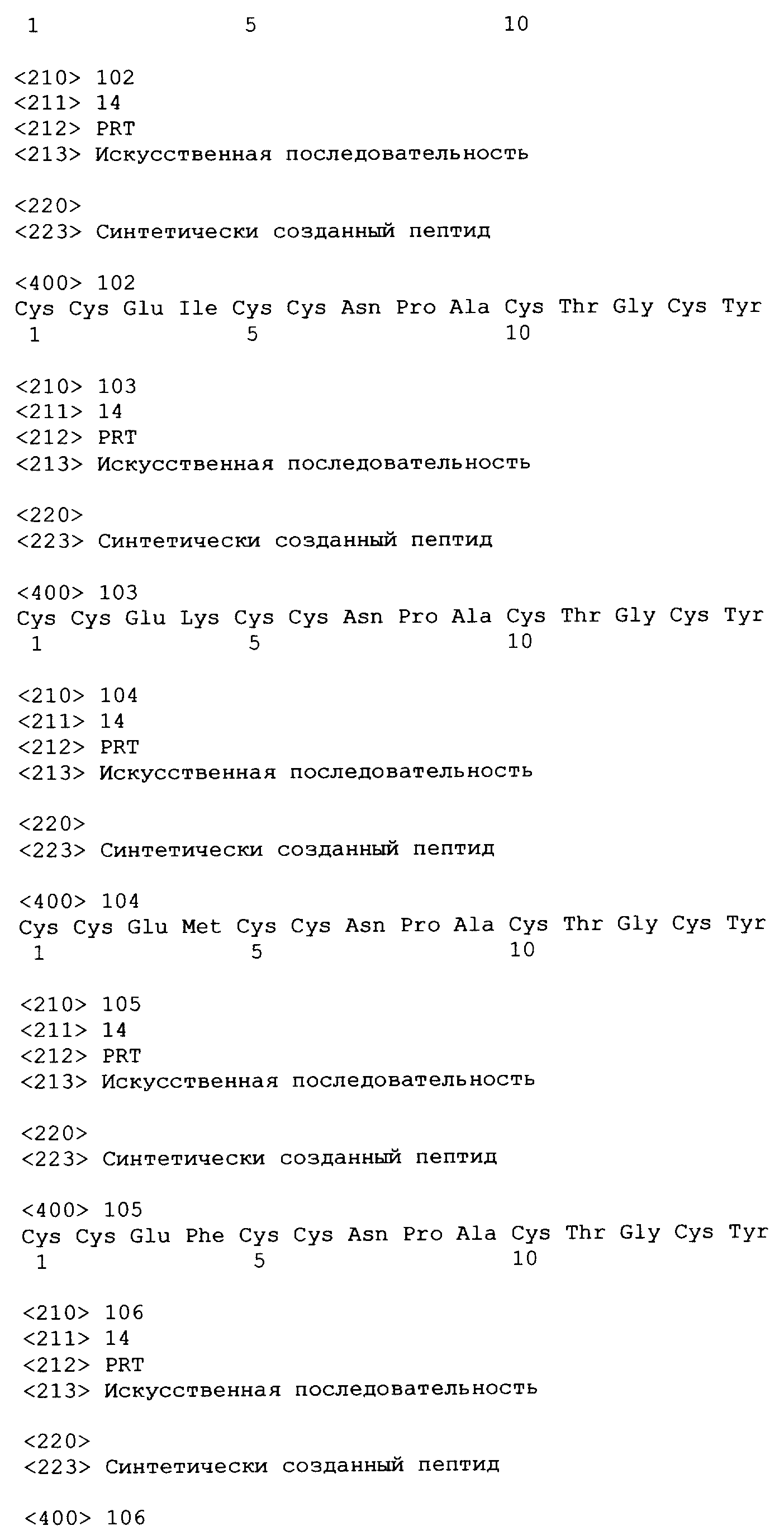Пептиды химически синтезировали коммерческой компанией пептидного синтеза. Меняющиеся выходы пептидов получали в зависимости от эффективности химического синтеза. Следовательно, четырьмя пептидами, в уменьшающемся порядке выхода, были: Cys Cys Glu Tyr Cys Cys Asn Pro Ala Cys Thr Gly Cys Tyr (SEQ ID NO:—; MD-1100), 10-20% выход; Cys Cys Glu Leu Cys Cys Asn Pro Ala Cys Thr Gly Cys Tyr (SEQ ID NO:-; MM416774); Asn Ser Ser Asn Tyr Cys Cys Glu Tyr Cys Cys Asn Pro Ala Cys Thr Gly Cys Tyr (SEQ ID NO:-; MD-915); Asn Ser Ser Asn Tyr Cys Cys Glu Leu Cys Cys Asn Pro Ala Cys Thr Gly Cys Tyr (SEQ ID NO:-MM-416776), <5% выход.