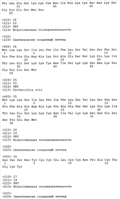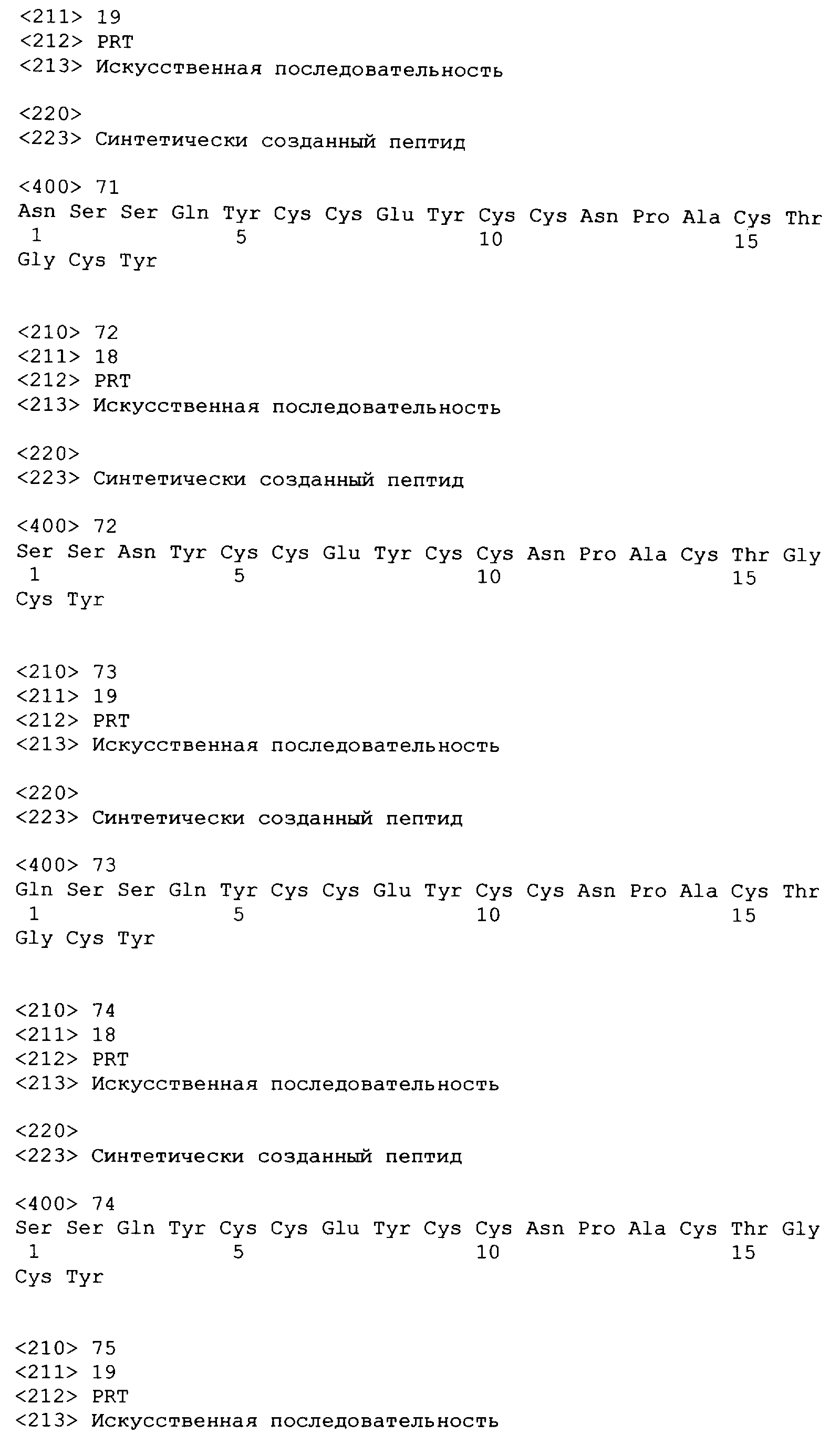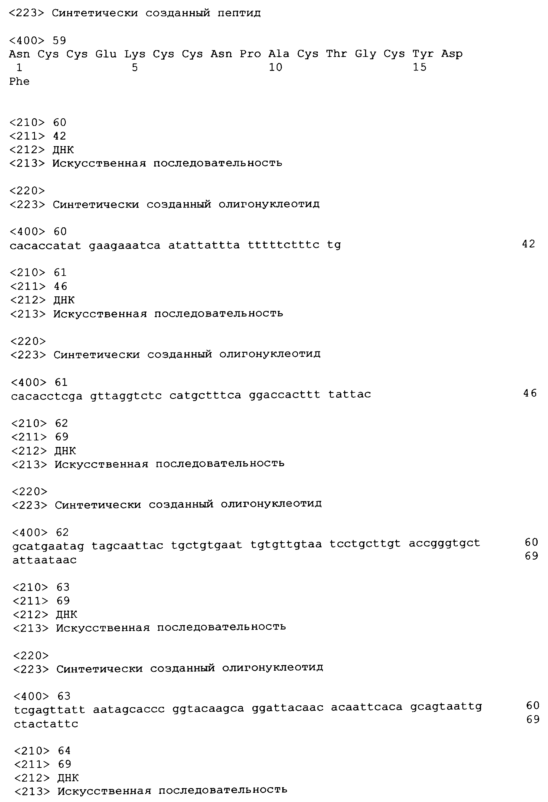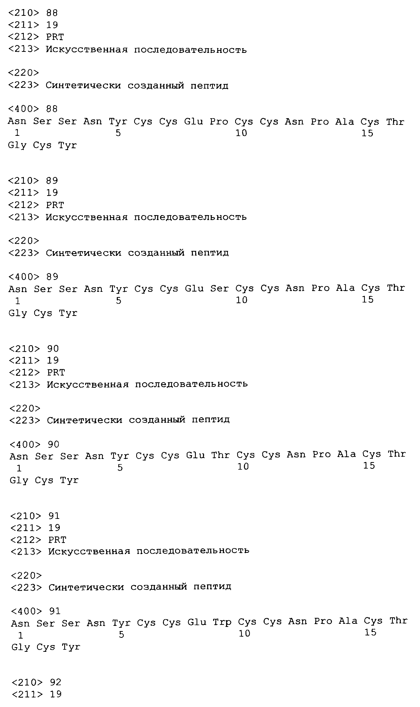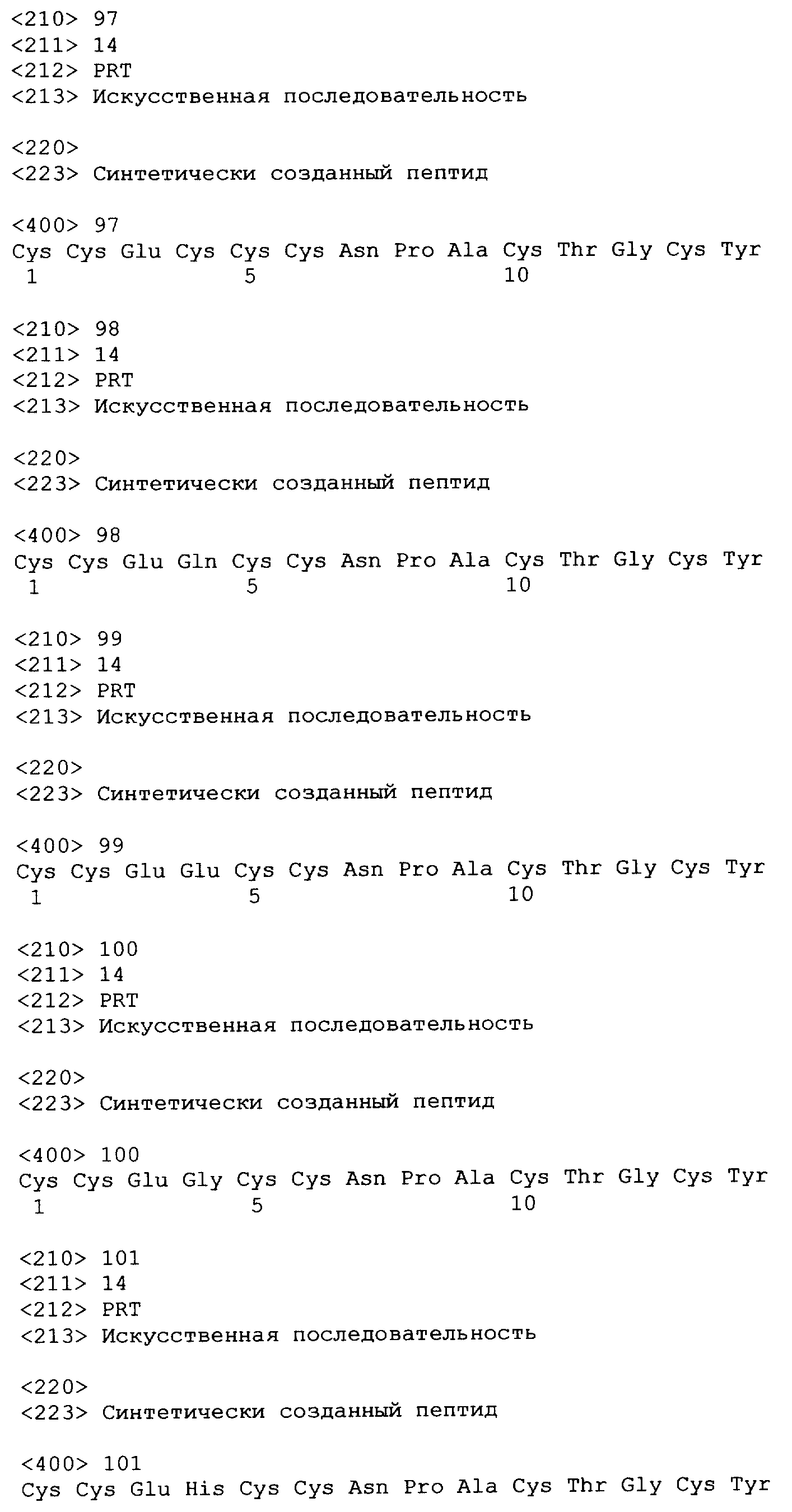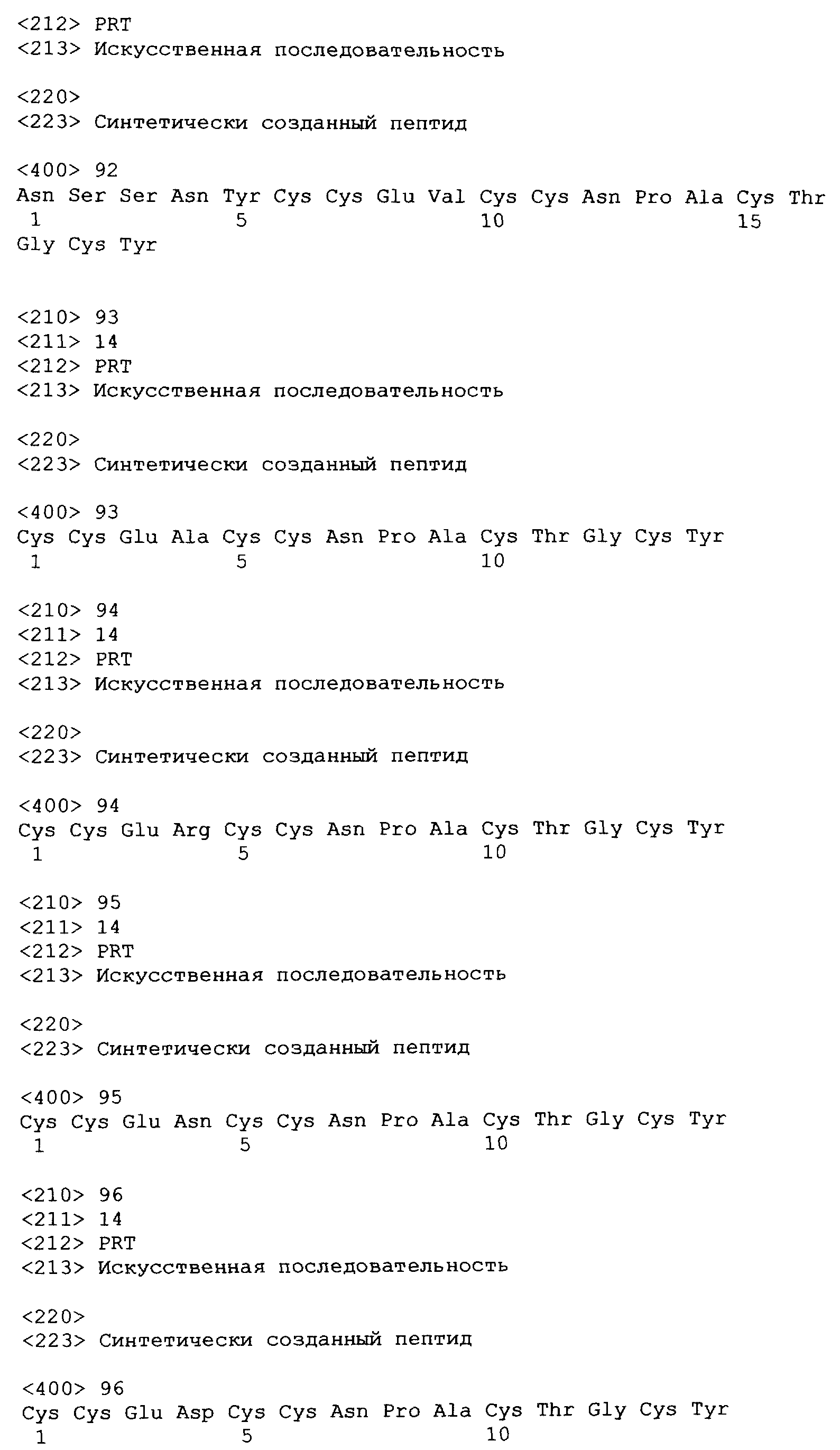 Пептиды химически синтезировали коммерческой компанией пептидного синтеза. Меняющиеся выходы пептидов получали в зависимости от эффективности химического синтеза. Следовательно, четырьмя пептидами, в уменьшающемся порядке выхода, были: Cys Cys Glu Tyr Cys Cys Asn Pro Ala Cys Thr Gly Cys Tyr (SEQ ID NO:—; MD-1100), 10-20% выход; Cys Cys Glu Leu Cys Cys Asn Pro Ala Cys Thr Gly Cys Tyr (SEQ ID NO:-; MM416774); Asn Ser Ser Asn Tyr Cys Cys Glu Tyr Cys Cys Asn Pro Ala Cys Thr Gly Cys Tyr (SEQ ID NO:-; MD-915); Asn Ser Ser Asn Tyr Cys Cys Glu Leu Cys Cys Asn Pro Ala Cys Thr Gly Cys Tyr (SEQ ID NO:-MM-416776), <5% выход.