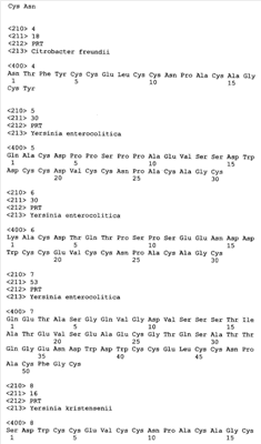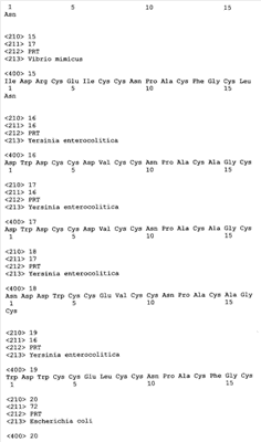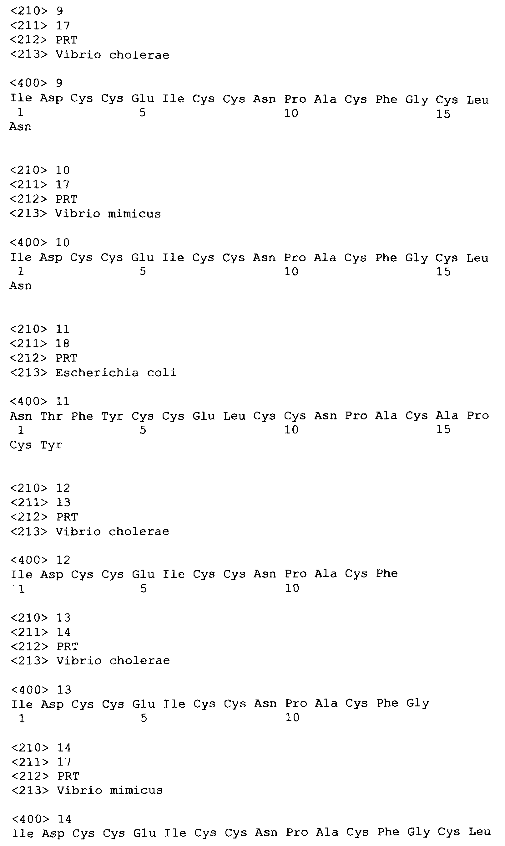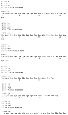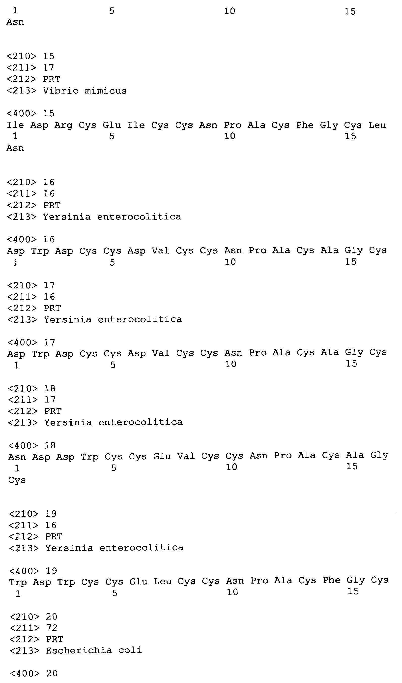 MOSELEY SL. et al. Isolation and nucleotide sequence determination of a gene encoding a heat-stable enterotoxin of Escherichia coli, Infect Immun., 1983 Mar; 39(3): 1167-74. HUANG X. et al. Nucleotide sequence of a gene encoding enterocolitica heat-stable enterotoxin that includes a pro-region-like sequence in its mature toxin molecule, MicrobPathol., 1997 Feb; 22(2): 89-97. YOSHINO K. et al. Characterization of a highly toxic, large molecular size heat-stable enterotoxin produced by a clinical isolate of Yersinia enterocolitica, FEBS Lett. 1995 Apr 10; 362(3): 319-22.
