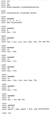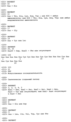 Когда Xaa19 представляет собой Trp, Tyr или Phe, пептид имеет участок расщепления химотрипсином, который расположен в положении, где расщепление освободит часть пептидного карбоксильного конца до Xaa19. Когда Xaa19 является Leu, Ile или Val, пептид может иметь участок расщепления химотрипсином, который расположен в положении, где расщепление освободит аминоконцевую часть пептида до Xaa19. При относительно высоком рН такой же эффект наблюдают, когда Xaa19 является His. Когда Xaa19 представляет собой Lys или Arg, пептид имеет участок расщепления трипсином, который расположен в положении, где расщепление освободит карбоксиконцевую часть пептида до Xaa19. Следовательно, если пептид включает обезболивающий пептидный карбоксиконец до Xaa19, пептид освободится в пищеварительном тракте при воздействии соответствующей протеазы. Среди обезболивающих пептидов, которые могут быть включены в пептид, находятся: AspPhe (как Xaa20Xaa21), эндоморфин-1, эндоморфин-2, ноцистатин, даларгин, люпрон и субстанция P и другие обезболивающие пептиды, описанные в данном описании. Такие пептиды могут, например, использоваться для замещения Xaa20Xaa21.
