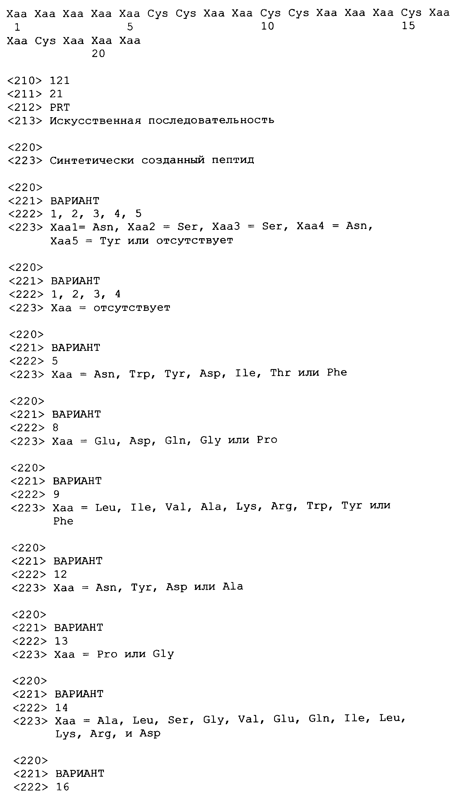 Cys10 Cys11 Xaa12 Xaa13 Xaa14 Cys15 Xaa16 Хаа17 Cys18 Xaa19 Xaa20 Xaa21, где Xaa1 Xaa2 Xaa3 Xaa4 Xaa5 является Asn Ser Ser Asn Tyr или отсутствует или Xaa1 Xaa2 Xaa3 Xaa4 отсутствует и Xaa5 является Asn, Trp, Tyr, Asp, Ile, Thr или Phe; Xaa8 является Glu, Asp, Gln, Gly или Pro; Xaa9 является Leu, Ile, Val, Ala, Lys, Arg, Trp, Tyr или Phe; Xaa12 является Asn, Tyr, Asp или Ala; Xaa13 является Pro или Gly; Xaa14 является Ala, Leu, Ser, Gly, Val, Glu, Gln, Ile, Leu, Lys, Arg, и Asp; Xaa16 является Thr, Ala, Asn, Lys, Arg, Trp; Xaa17 является Gly, Pro или Ala; Xaa19 является Trp, Tyr, Phe или Leu; и Xaa20 Xaa21 является AspPhe или отсутствует или Xaa20 является Asn или Glu и Xaa21 отсутствует или Xaa19 Xaa20 Xaa21 отсутствует.
