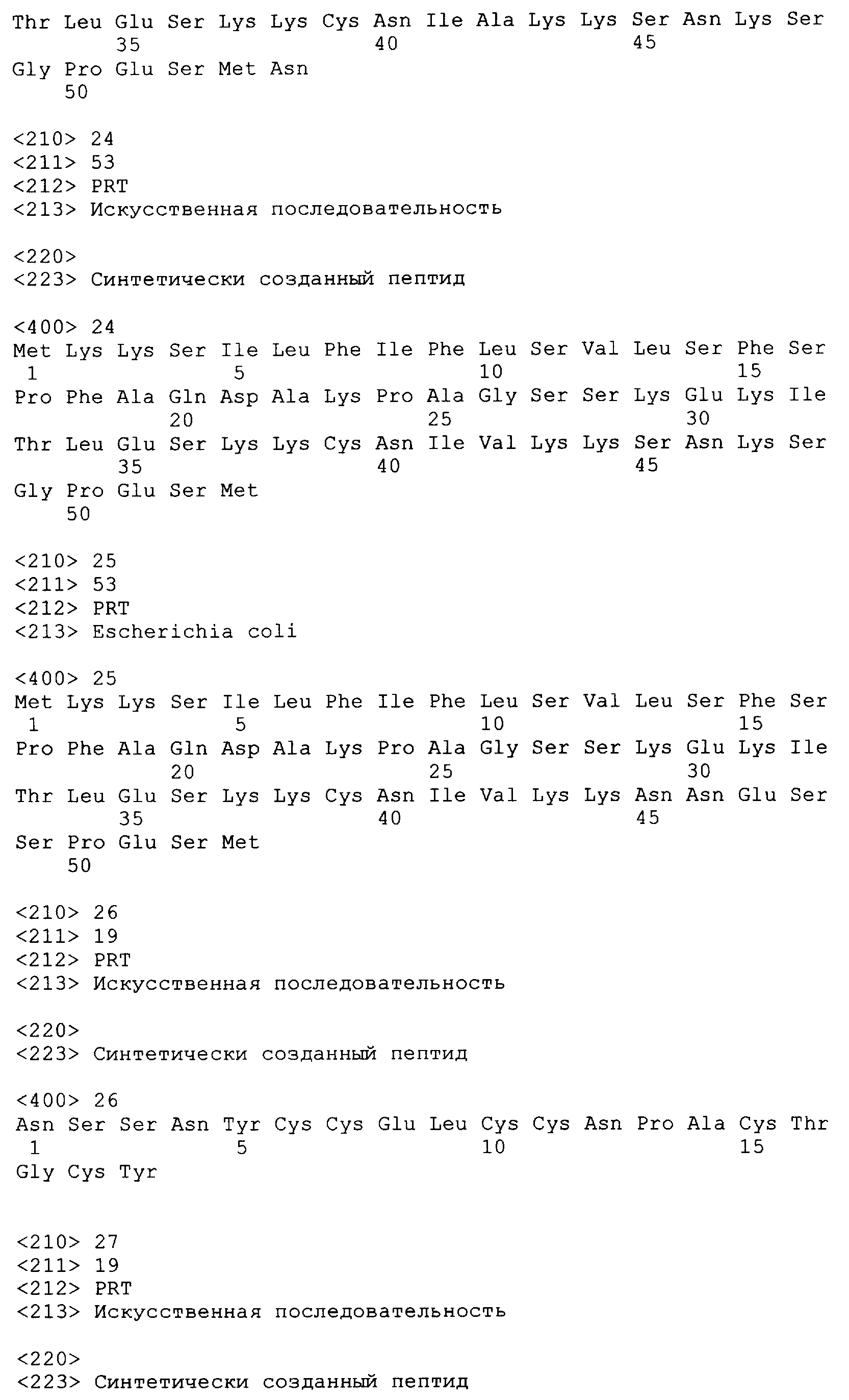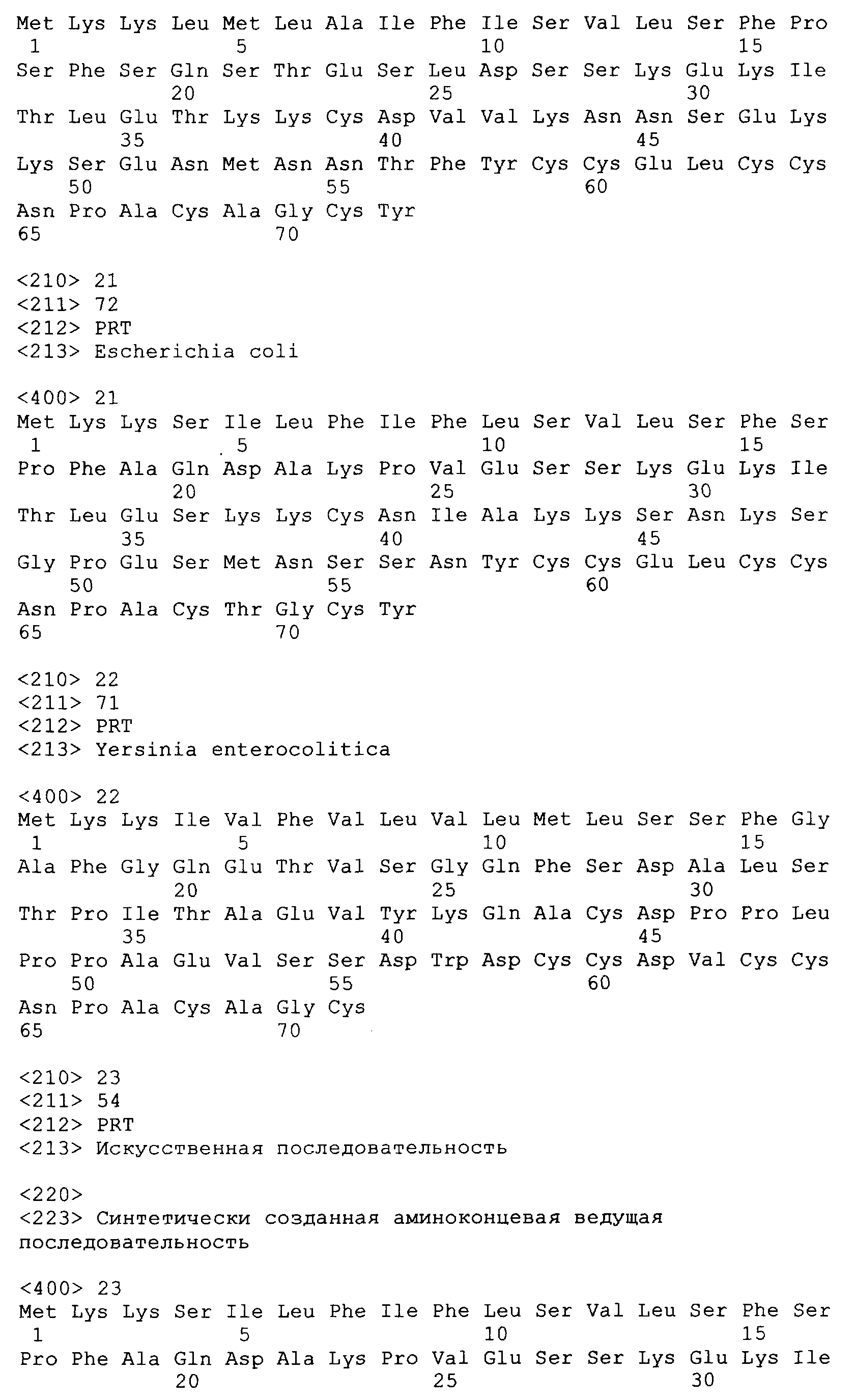 mkksilfiflsvlsfspfaqdakpagsskekitleskkcnivkksnksgpesm (SEQ ID NO:__), которая отличалась от последовательности аминокислот предшественника термостабильного энтеротоксина a2 (sta2; mkksilfiflsvlsfspfaqdakpagsskekitleskkcnivkknnesspesm (SEQ ID NO:___); GenBank®, каталожный No. Q47185, GI: 3913876) в трех положениях (указанных подчеркнутым и жирным текстом) около C-конца. Для создания векторов экспрессии с препропоследовательностью комплиментарные олигонуклеотиды, кодирующие каждый вариант ST пептида или ST пептид дикого типа, отжигали и клонировали в вектор экспрессии MB3976. Для создания MB3984 (кодирующей MM-416776 пептид полной длины ST пептид дикого типа в виде препробелка), содержащей последовательность аминокислот, NSSNYCCELCCNPACTGCY (SEQ ID NO:___), сшивали ниже препропоследовательности, MB 3976 поглощали с помощью BsaI/XhoI и связывали с отожженными олигонуклеотидами MO3621 (5′ GCATGAATAGTAGCAATTACTGCTGTGAATTGTGTTGTAATCCTGCTTGTAC CGGGTGCTATTAATAAC 3′ (SEQ ED NO:_)) и MO3622 (5′ TCGAGTTATTAATAGCACCCGGTACAAGCAGGATTACAACACAATTCACAGCAGTAATTGCTACTATTC 3′(SEQ ID NO:_)). Для создания MB3985 (кодирующего MD-915 в виде препробелка), содержащего следующую последовательность аминокислот, NSSNYCCEYCCNPACTGCY, сшитую ниже препропоследовательности, MB 3976 поглощали с помощью BsaI/XhoI и связывали с отожженными олигонуклеотидами MO3529 (5′ GCATGAATAGTAGCAATTACTGCTGTGAATATTGTTGTAATCCTGCTTGTACCGGGTGCTATTAATAAC 3′ (SEQ ID NO:_)) и MO3530 (5′ TCGAGTTATTAATAGCACCCGGTACAAGCAGGATTACAACAATATTCACAGCAGTAATTGCTACTATTC 3′(SEQ ID NO:_)).