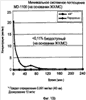 Проводили подобное исследование биодоступности, в котором использовали ЖХМС вместо ELISA для определения MD-1100. Исходно, образцы сыворотки экстрагировали из цельной крови подвергшихся воздействию и контрольных мышей, затем вводили непосредственно (10 мл) на встроенную колонку твердофазной экстракции (SPE) (Waters Oasis HLB колонка 25 мм, 2,0×15 мм, прямая связь) без последующей обработки. Образец на колонке SPE промывали 5% метанолом, 95% раствором dH2O (2,1 мл/мин, 1,0 минута), затем загружали на аналитическую колонку с использованием клапанного переключателя, который помещает колонку SPE в перевернутый путь тока на аналитической колонке (Waters Xterra MS C8 колонка 5 мм IS, 2,1×20 мм). Образец элюировали из аналитической колонки градиентом с обращенной фазой (подвижная фаза A: 10 мМ гидроксида аммония в dH2O, подвижная фаза B: 10 мМ гидроксида аммония в 80% ацетонитриле и 20% метаноле; 20% B для первых 3 минут, затем переход до 95% B в течение 4 мин и удержание в течение 2 мин, все при скорости тока 0,4 мл/мин). На 9,1 минутах градиент возвращается к исходным условиям 20% B в течение 1 мин. MD-1100 элюировали из аналитической колонки на 1,45 минутах, и определяли тройной-четверной масс-спектрометрией (MRM, 764 (+2 состояние заряда)>182 (+1 состояние заряда) Да; потенциал воронки=30 В; столкновение=20 эВ; исходное разрешение=2 Да на основном пике; дочернее разрешение=2 Да на основном пике). Инструментальный ответ преобразовывали в единицы концентрации сравнением со стандартной кривой с использованием известных количеств химически синтезированного MD-1100, полученного и введенного в сыворотку мыши с использованием такой же методики.