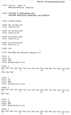 Настоящее изобретение относится к медицине и касается способов и композиций для лечения желудочно-кишечных расстройств. Сущность изобретения включает очищенный полипептид из 14 аминокислот, применяемый для лечения желудочно-кишечных расстройств и состояний (например, расстройств желудочно-кишечной моторики, функциональных желудочно-кишечных расстройств, гастро-эзофагеальной рефлюксной болезни (ГЭРБ), болезни Крона, язвенного колита, воспалительного заболевания кишечника. Изобретение также включает способ увеличения активности гуанилатциклазы с помощью указанного пептида. Преимущество изобретения заключается в расширении области применения. 4 н. и 5 з.п. ф-лы, 1 табл., 10 ил.