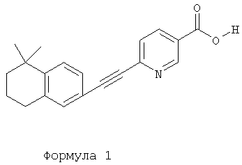 Активным лекарством в данном изобретении может быть лекарство любого типа, использующееся в лечении заболеваний или состояний, затрагивающих дальнюю область глаза, которое может образовываться при гидролизе его пролекарства, представляющего собой эфирное производное, в биологических условиях. Предпочтительные активные лекарства – это ретиноиды, простагландины, альфа-2-адренергические рецепторные антагонисты, бета-адренергические антагонисты, дофаминергические антагонисты, холинергические антагонисты, ингибиторы тирозин-киназы, противовоспалительные средства, кортикостероиды, N-метил-О-аспартат-антагонисты (NMDA), противоопухолевые и антигистаминные средства. В предпочтительном варианте данного изобретения активные лекарства являются ретиноидами. Ретиноиды определяются как соединения, имеющие ретиноидоподобную активность. Соединения, имеющие ретиноидную активность, хорошо известны в науке и описаны в большом количестве патентной литературы в Соединенных Штатах и других странах, так же как и в научных публикациях. Без ограничения объема изобретения представлены некоторые примеры ретиноидов, являющихся согласно данному изобретению активными лекарствами: 13-цис-ретиноевая кислота, 13-цис-ретинол, все транс-ретиноевые кислоты, все транс-ретинолы. Наиболее применимым ретиноидом, который выступает в качестве активного лекарства в более предпочтительном варианте данного изобретения, является 4,4-диметил-6-[2′-(5″-карбокси-2″-пиридил)-этинил]-тиохроман, иначе известный как тазаротеновая кислота, имеющая формулу 1, приведенную ниже.