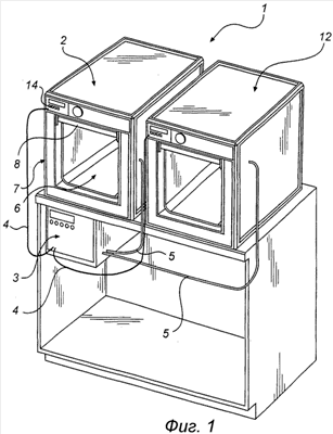 Стерилизационный блок 2 и блок 3 обработки механически отделены друг от друга, т.е. находятся в отдельных корпусах. Стерилизационный блок 2 по существу содержит стерилизационную камеру 6, в которой размещаются стерилизуемые предметы, и наружный корпус 7 стерилизационного блока. Стерилизационная камера 6 может быть изготовлена, например, из металла или полимера. Дверной элемент 8 либо уплотняет упомянутую камеру 6, либо обеспечивает доступ к ней, что более подробно описывается ниже. Между камерой 6 и корпусом 7 могут быть обеспечены средства тепло- и звукоизоляции (не показаны). Стерилизационный блок 2 может также иметь средство 14 ввода управления стерилизационным устройством для пользователя.