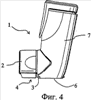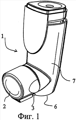 В предпочтительном варианте осуществления изобретения колпачок (2) прикреплен к полоске (3) с помощью скользящего устройства (4). Таким образом, он может скользить вперед и назад между упорами. Диапазон возможного перемещения должен быть достаточным, чтобы колпачок (2) мог находиться в положении, в котором он полностью закрывает сопло (5), но мог скользить в направлении от корпуса (7), позволяя повернуть полоску вниз от основания (6) главного корпуса (7) ингалятора (1). В предпочтительных вариантах осуществления изобретения полоска (3) может поворачиваться (8) так, что может находиться над задней стенкой главного корпуса (7) ингалятора или прилегать к ней. В наиболее предпочтительном варианте полоска не повторяет контур задней стенки главного корпуса. Однако в других вариантах задняя стенка может иметь выемку (10), в которую можно поместить полоску и даже зафиксировать ее там. В этом случае полоска (3) и колпачок (2) могут быть полностью отведены от сопла (5) и пользователь получает возможность свободно вдыхать медикамент, даже если он не держит руками полоску и колпачок в этом отведенном положении.