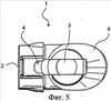 на фиг.4 показан вид сбоку колпачка мундштука, который может быть иметь ингалятор согласно предпочтительному варианту осуществления изобретения, причем колпачок изображен сбоку в закрытом положении, когда он надет на мундштук и закрывает его; и