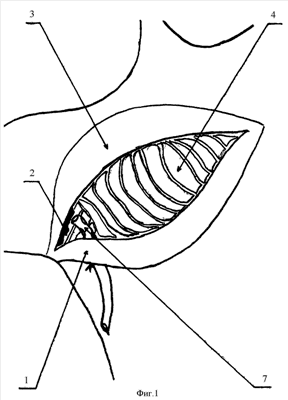 После этого в соответствии с изобретением устанавливают дополнительно два дренажа 5, 6 через контрапертуры верхнего 3 и нижнего 1 кожных лоскутов во внутреннем углу раны и фиксируют их к коже узловыми швами, причем дренажи ориентируют навстречу друг другу, при этом конец верхнего дренажа 5 располагают у места окончания мобилизации нижнего кожного лоскута 1, а конец нижнего дренажа 7 – у места окончания мобилизации верхнего кожного лоскута 3. Затем концы каждого из названных дренажей фиксируют к большой грудной мышце 4, накладывают внутрикожный непрерывный шов 8. После этого в послеоперационном периоде осуществляют непрерывное отмывание операционной раны в течение первых 24 часов раствором натрия хлорида 0,9%, который вводят капельно в верхний и нижний дренажи со скоростью 1,7 мл/мин, а отмытую жидкость эвакуируют через вакуум-дренаж, установленный в подмышечной области, затем верхний 6, и нижний 7 дренажи удаляют. В дальнейшем осуществляют аспирацию раневого отделяемого через дренаж, установленный в подмышечной области.