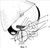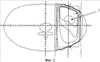 Фиг.3. Мишень ИОЛТ для правой и левой половины ободочной кишки (2 – мочеточник, 3 – зона интраоперационного облучения, 4 – нижнегоризонтальная ветвь двенадцатиперстной кишки).