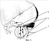 – мобилизации и взятии на держалки обоих мочеточников (2) для последующего контроля за их местоположением во время установки аппликатора в операционном поле и частичной мобилизации нижнегоризонтальной ветви 12 п. кишки (4),