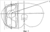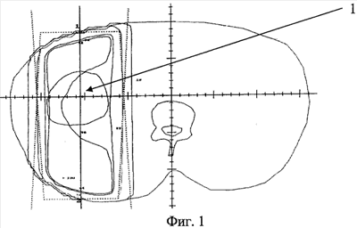 Фиг.1. Карта дозового распределения при предоперационном облучении опухоли, локализованной в правой половине ободочной кишки (1 – опухоль).