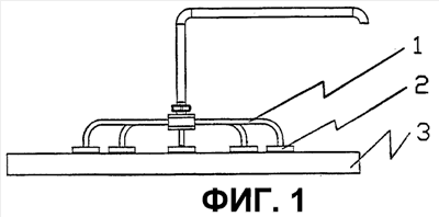 Фиг.1 – боковая проекция устройства распределения, содержащего первую систему 1 транспортирования текучей среды, пункты 2 доставки и распределительную тарелку 3;