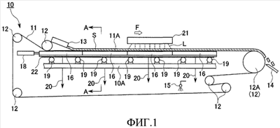 Вакуумные лотки 16, смежные друг с другом в направлении перемещения F, соединены вместе. Среди этих вакуумных лотков 16, как показано на фиг.1, приводной цилиндр 18, такой как воздушный цилиндр, установлен на раме 10А корпуса 10 устройства. Приводной цилиндр 18 расширяется и сжимается вдоль направления перемещения F и соединен с вакуумным лотком 16, который расположен дальше всех по потоку по отношению к направлению перемещения F. Из-за расширения и сужения приводного цилиндра 18 все вакуумные лотки 16 могут совершать возвратно-поступательное движение вместе на заранее установленную величину хода в переднем и обратном направлениях перемещения F, то есть могут совершать возвратно-поступательное движение вдоль этого направления перемещения F. Наряду с передним и обратным перемещением вакуумных лотков 16 вакуумные шланги 20В, вторые концы которых подсоединены к вакуумному устройству, изгибаются путем упругого деформирования, и соединительная арматура 20 совершает возвратно-поступательное движение как единое целое.