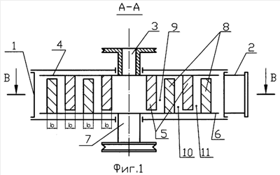 Максимальный осевой размер поперечного сечения ударных элементов определяется из условия h=1,1 1,2b, где b – минимальный размер поперечного сечения ударного элемента. Исходя из равнопеременного изменения размеров осевых зазоров геометрическая форма ударных элементов в поперечном сечении также равнопеременно изменяется от размеров b×b (например, 10×10 мм) до размеров b×h (например, 10×12 мм). При этом осевые расстояния между рядами ударных элементов верхнего диска и размещенных между ними рядами ударных элементов нижнего диска изменяются в пределах 180° от 0,7 1,3 до 2,7 3,3 мм.