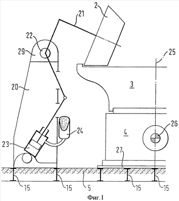 Как правило, используются двух-, трех- и четырехвалковые мельницы, выполненные по модульной системе. Истирающая мельница модульной конструкции для измельчения в воздушном потоке системы Loesche известна из ЕР 0879066 В1. На фиг.1 подобная истирающая мельница изображена фрагментарно при виде сбоку и без кожуха. Измельчающие валки 2, установленные каждый с возможностью поворота с помощью коромысла 21 вокруг оси 22 в подшипниковом кронштейне 20 станины 20, обкатываются по чаше 3, приводимой во вращение приводным валом 26 через передачу 4. Истирающая мельница содержит на фиг.1 два измельчающих валка, из которых показан, однако, только один валок 2. Показан, кроме того, коромысловый блок из коромыслового цилиндра 23 и гидроаккумулятора или газовой пружины 24. Станины 20, приданные каждая одному измельчающему валку 2, своим нижним концом закреплены в зоне фундамента 5 мельницы, являющегося, как правило, бетонным фундаментом, на стальной фундаментной раме 15. Передача 4 мельницы через промежуточную или подошвенную плиту 27 заанкерена в фундаменте 5 или фундаментной раме 15.
