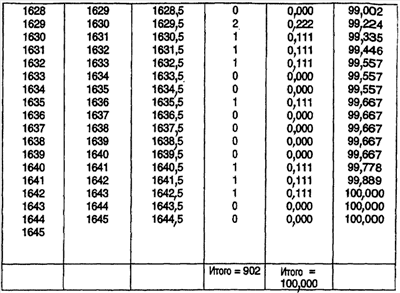 Нормализованную частоту получают посредством умножения значения частоты на 100 и деления на сумму столбца нормализованных частот. Совокупная нормализованная частота представляет собой суммирование конкретной нормализованной частоты с суммой предыдущих нормализованных частот.
