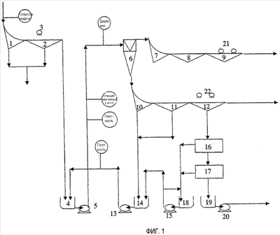 До начала осуществления способа, показанного на фиг.1, наибольший размер необработанного угля может быть уменьшен до 50 мм. Согласно фиг.1 необработанный уголь разделяют на дуговом сите 1, а затем на вибрационном сите 2 с добавлением промывочной воды 3. Такое устройство обеспечивает удаление из необработанного угля мелких частиц, обычно меньших 2-0,2 мм, и весь материал, прошедший через сито, обрабатывают в устройствах, которые здесь не упомянуты. Материал, остающийся на сите, под действием силы тяжести проходит в отстойник 4, из которого его нагнетают 5 к циклону 6 с плотной средой. На фиг.1 можно заметить, что плотную среду добавляют к крупным частицам угля в питающем отстойнике 4 циклона с плотной средой. Крупный необработанный уголь разделяют в циклоне 6 с плотной средой для получения продукта с пониженной зольностью и отходов с повышенной зольностью. Продукт отделяют от плотной среды на дуговом сите 7, дренажном сите 8 и на промывочном сите 9. Дуговое сито и дренажное сито обеспечивают удаление массы плотной среды, которая затем может рециркулировать к отстойнику 14 с плотной средой. В промывочном сите 9 используют добавляемую воду 21, 22 (грязную и очищенную) для содействия удалению среды, прилипшей к частицам угля. Нижний сход с промывочного сита значительно разбавлен и должен быть сконцентрирован, так чтобы вода была удалена перед тем, как его можно было бы повторно использовать при работе циклона с плотной средой. Подобные дуговое сито 10, дренажное 11 и промывочное сито 12 обеспечивают возврат плотной среды, имеющейся в материале нижнего схода с сита в циклоне с плотной средой.