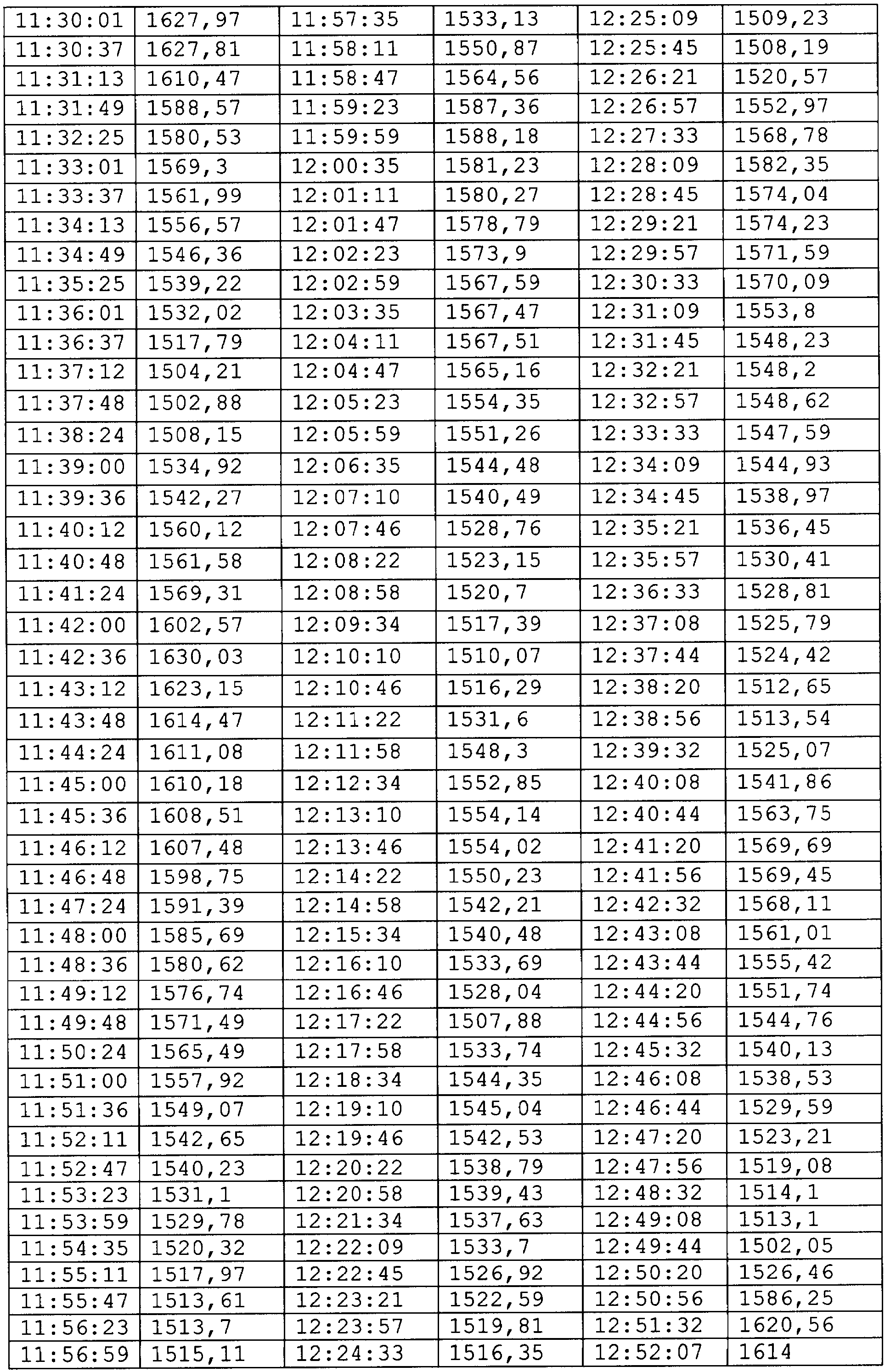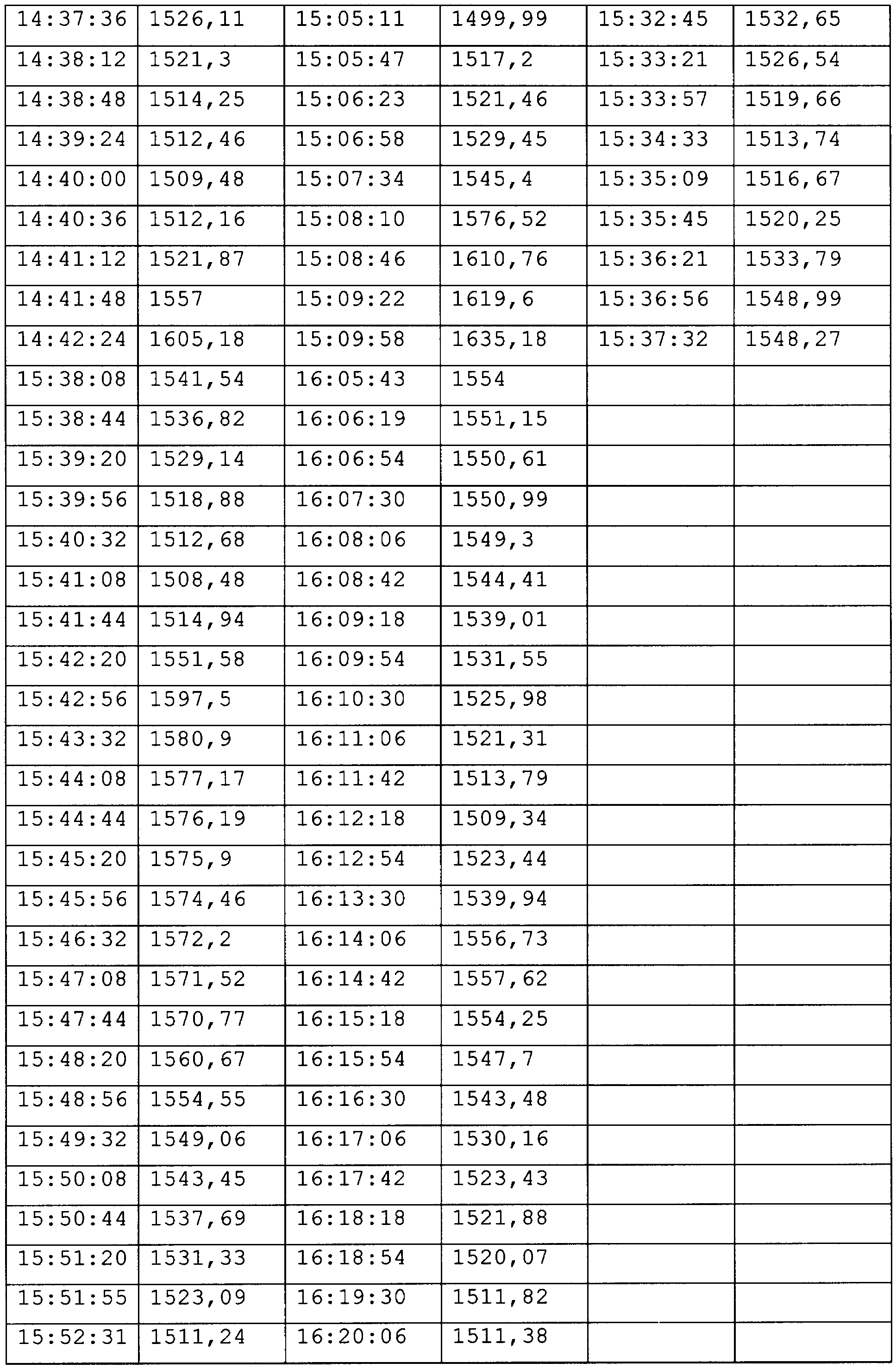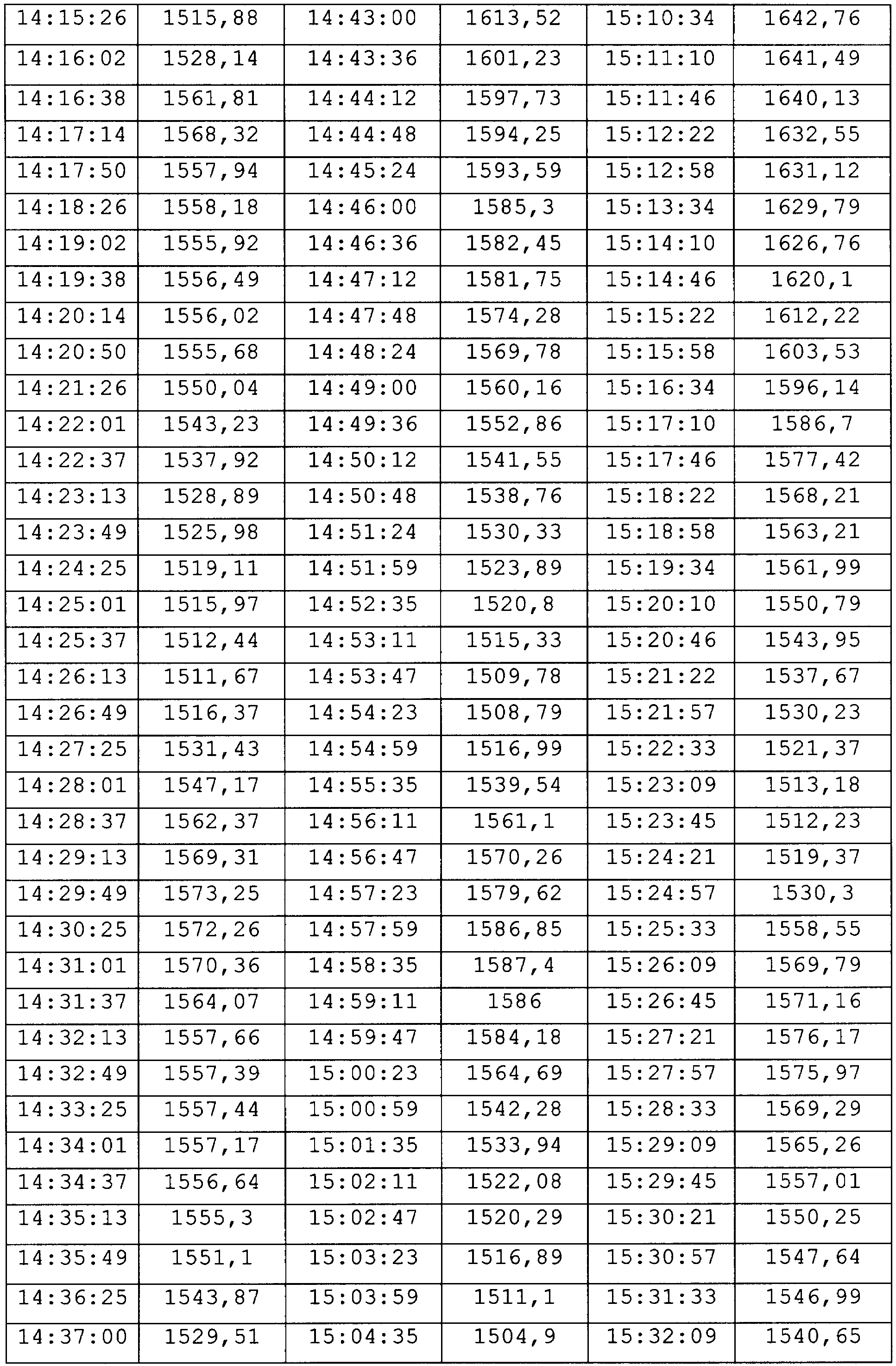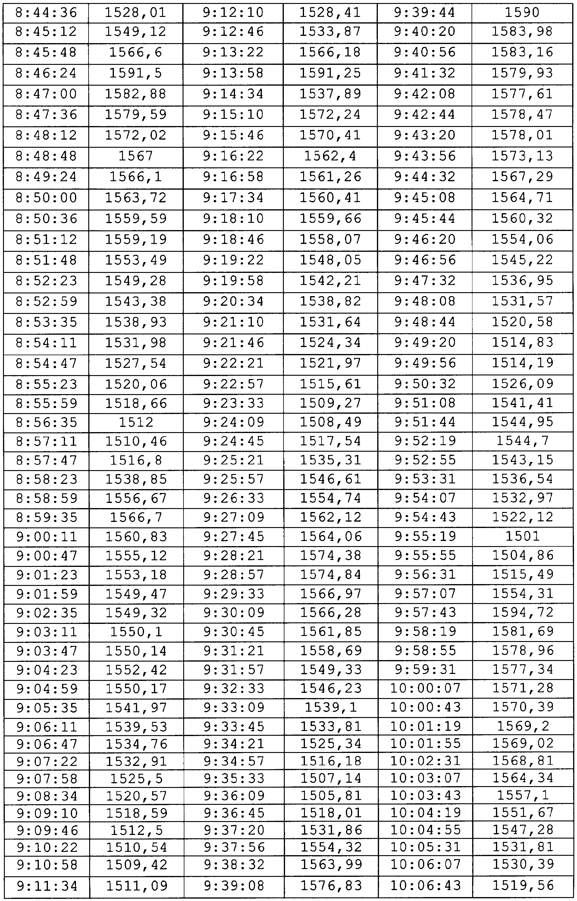 В представленной ниже Таблице 1 приведены результаты измерений, которые могут быть получены за период времени порядка 9 часов и могут быть использованы для обработки в процессоре 50.