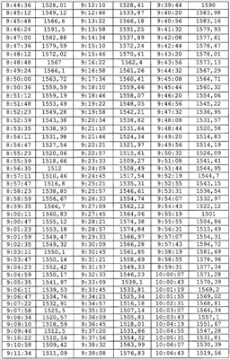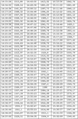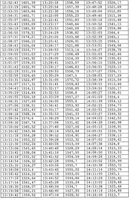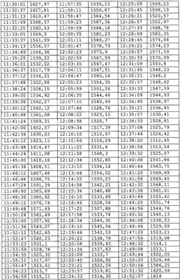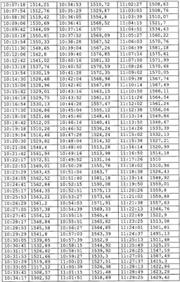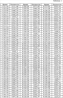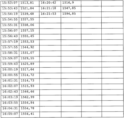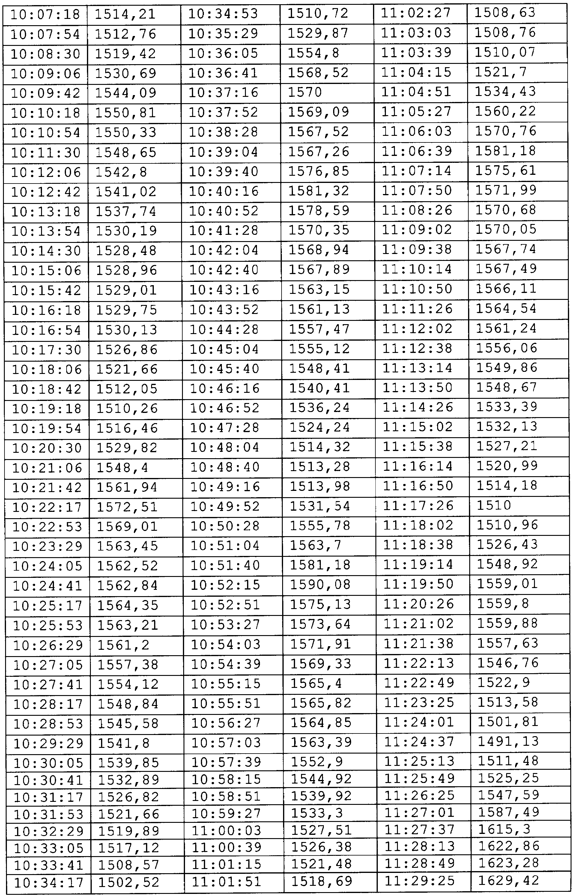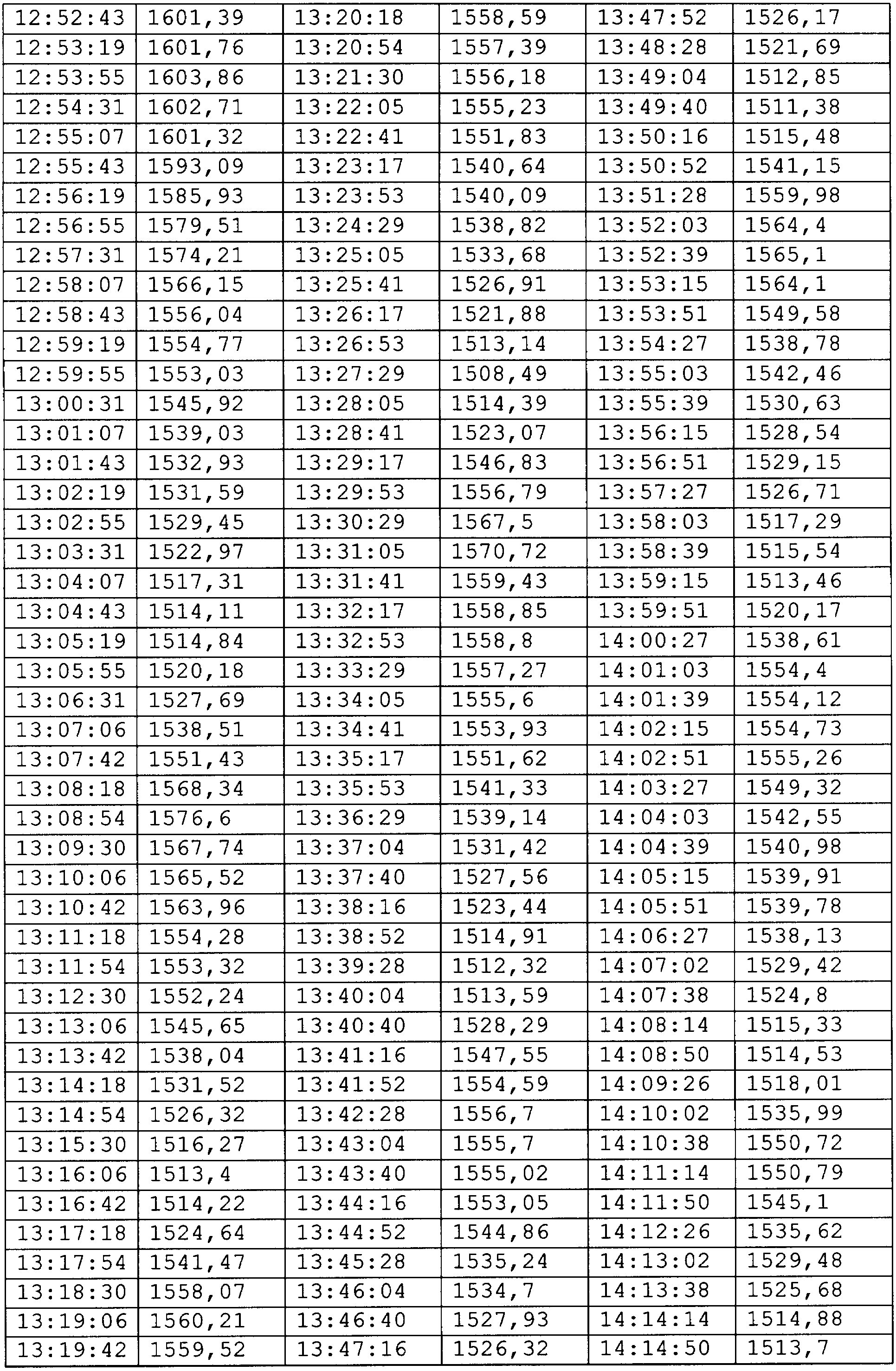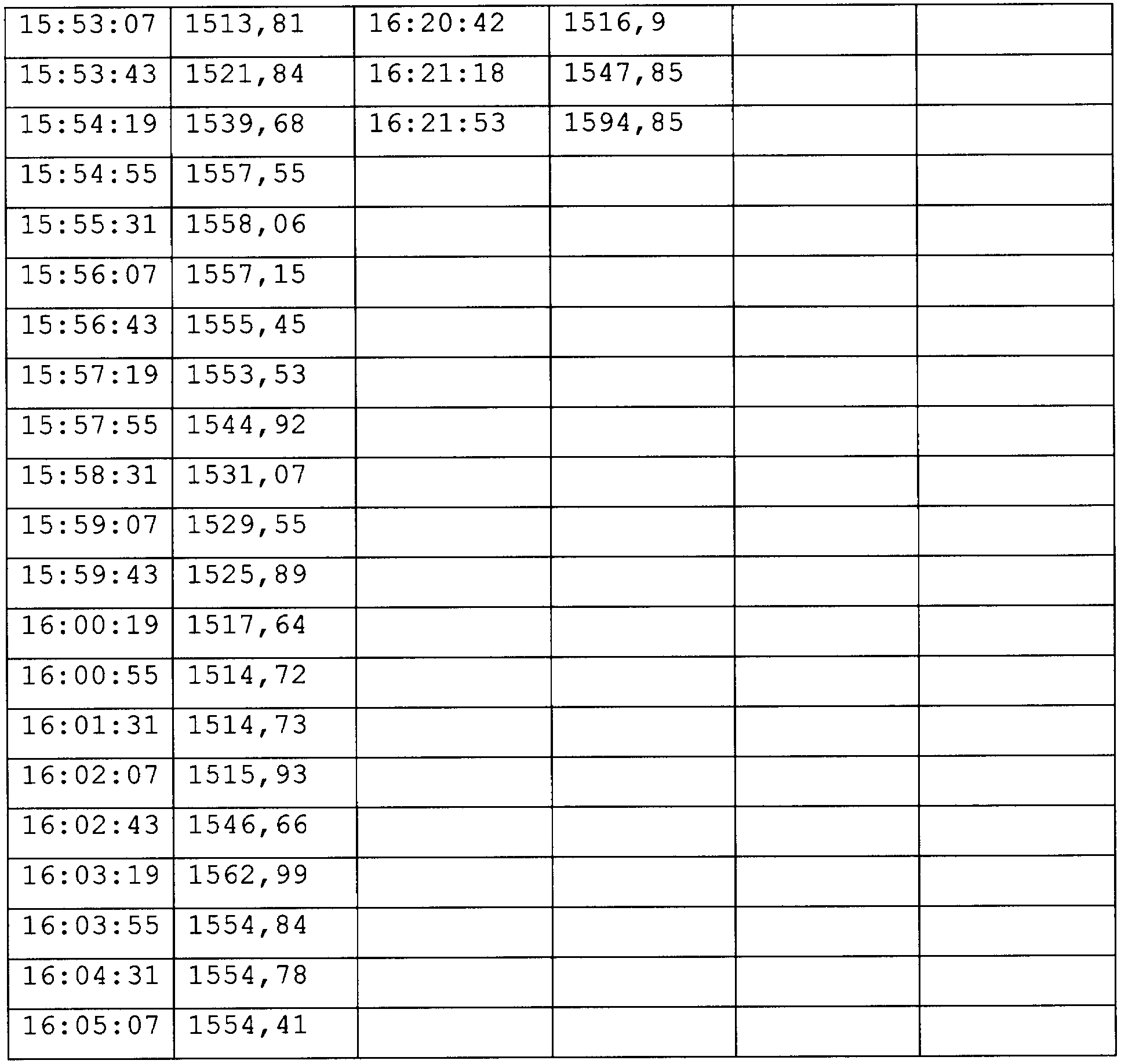 В представленной ниже Таблице 1 приведены результаты измерений, которые могут быть получены за период времени порядка 9 часов и могут быть использованы для обработки в процессоре 50.