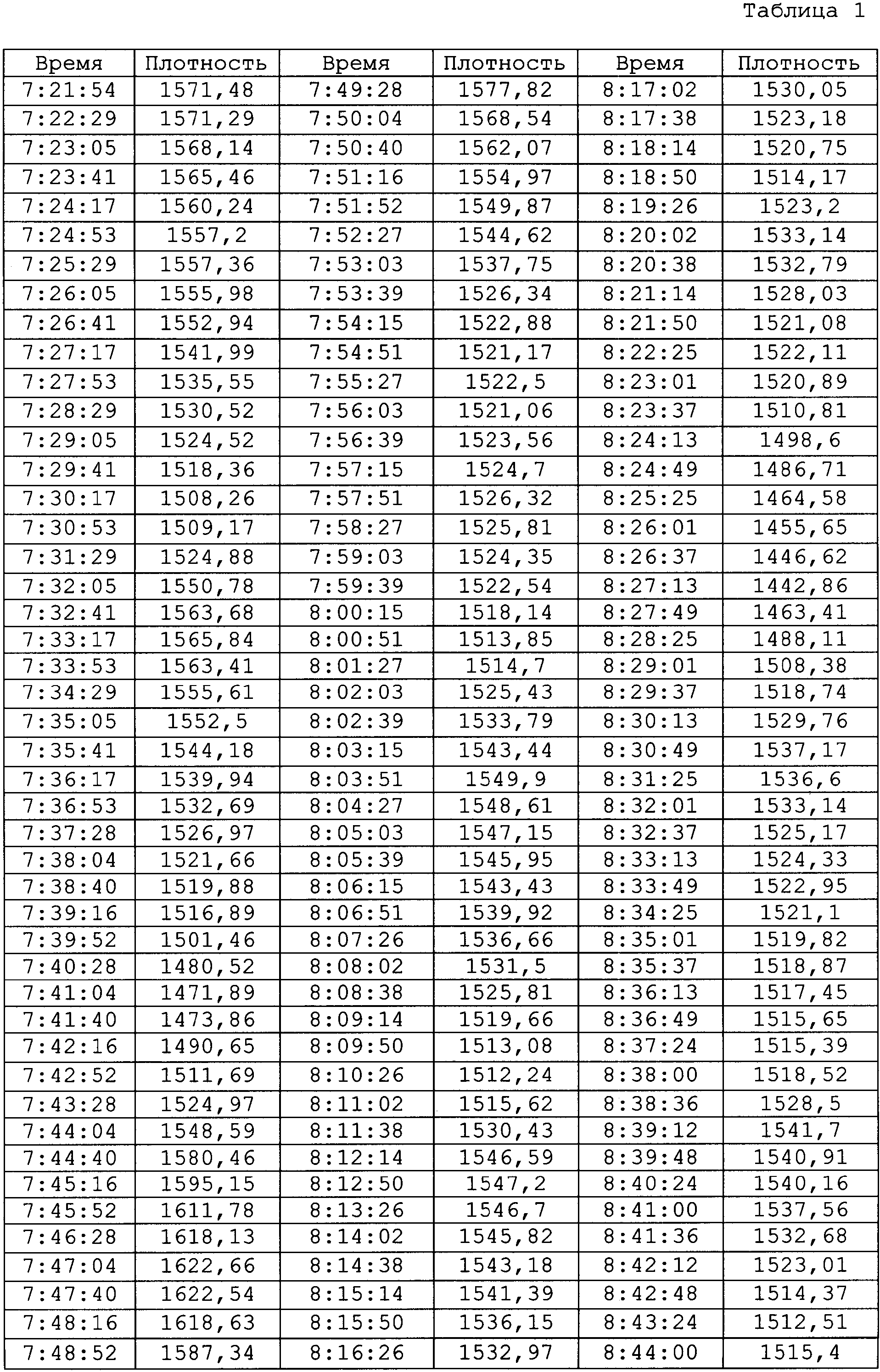 Значения Ер, индуцируемые средой, периодически определяют после первоначального периода порядка 9 часов посредством простого пропуска первого выполненного измерения и добавления к общему количеству измерений следующего последовательно выполненного измерения. Например, в Таблице 1 последующее значение Ер, индуцируемое средой, может быть вычислено посредством пропуска плотности, считываемой во время 7:21:54, и добавления к списку плотности значений, измеренных в период времени 16:21:53. Это может обеспечить новое значение Ер, индуцируемое средой, для сравнения с заданным значением каждые 36 секунд. Очевидно, что если желателен больший период, то дополнительные более ранние показания могут быть проигнорированы, и перед тем как будет вычислено дальнейшее значение Ер, индуцируемое средой, выполняют большее количество последующих измерений. Кроме того, если желательны измерения значения Ер, индуцируемые средой, за более короткий период, то данные, касающиеся плотности, могут быть собраны за более короткий период и использованы способом, подобным способу, который представлен выше.