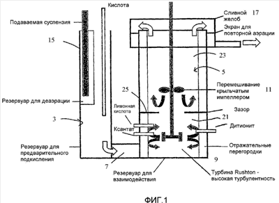 Вышеописанное устройство из двух камер 21 и 23, ограниченное горизонтальной перегородкой 25 турбины 9 импеллера 11 и средств для подачи восстановителя, кондиционера и комплексообразователя в нижнюю камеру 21, обеспечивают поршневой режим подачи пульпы вверх через второй резервуар 5 с тщательным смешиванием пульпы и реагентов в нижней камере 21 и достаточный период взаимодействия пульпы и реагентов по мере продвижения пульпы вверх через нижнюю камеру 21 и верхнюю камеру 23 с минимальным риском формирования циркуляционных потоков пульпы/реагентов.